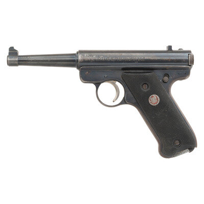 .22 LR. 4.75" barrel length. SN: 8509. Blued finish with polished bolt mounting checkered black synthetic grips, fixed rear notch, and front blade sights. Simple blowback operated internal hammer fired autoloading pistol fed by detachable single stack magazines. Standard make and model marks include RUGER 22 CAL. LONG RIFLE/AUTOMATIC PISTOL to left receiver and STURM, RUGER & CO./SOUTHPORT, CONN. U.S.A. on the right. Item comes with a Smith & Wesson monogram marked Hunter style holster marked 19 83 below he monogram. {C&R}
