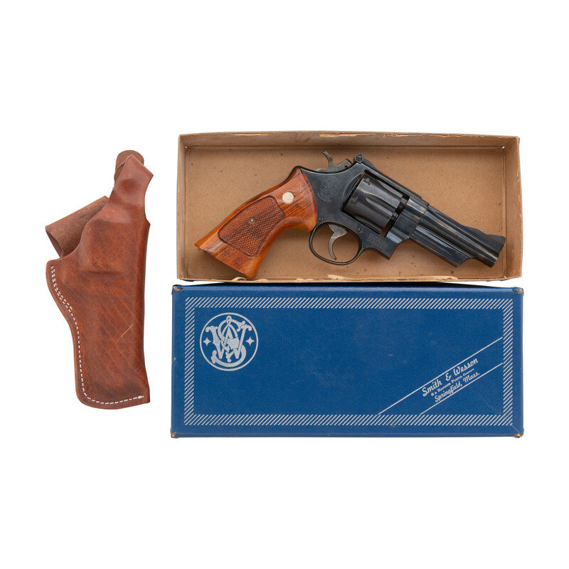 .44 Special. 4" barrel length. SN: ABZ0971. Blued metal finish with case colored hammer and trigger mounting checkered Smith & Wesson medallion Goncalo Alves grips. Double action six shot hand ejector revolver featuring adjustable rear notch and matted Baughman quick draw front ramp sights. Mounts a wide smooth trigger. Standard make and model marks include four line address to right frame and Smith & Wesson monogram logo to sideplate. Item features a non recessed cylinder on a three screw frame without internal lock. Comes in its original blue cardboard box with intact end label, owner's manual, and a leather GUIDE GEAR outside waistband holster. {MODERN}