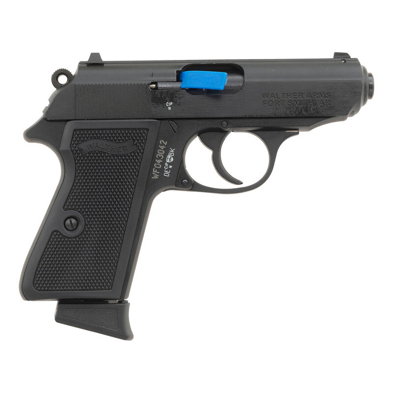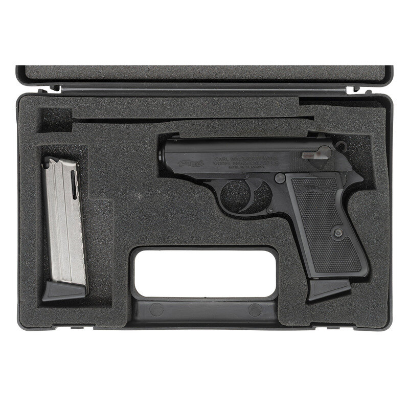 .22 LR. 3.3" barrel length. SN: WF043042. Black oxide finish on slide with black anodized frame mounting checkered black synthetic WALTHER banner grips and fixed sights. Simple blowback operated DA/SA autoloading pistol fed by detachable single stack magazines. Standard make, model marks, and German firing proofs. Item comes in its original black synthetic hard case with one spare magazine, two replacement front sights, front sight removal tool, and the owner's manual.