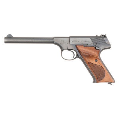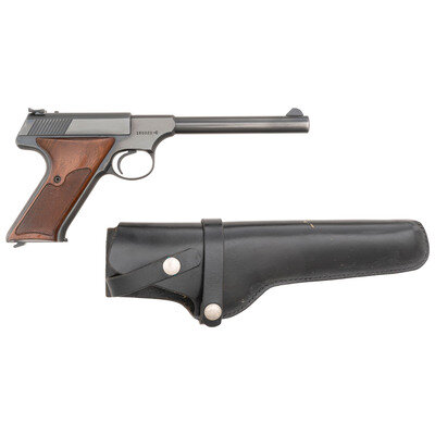 .22lr. 6" barrel length. SN: 165020-C. Blued finish on barrel and frame with wood thumbrest grip panels. Simple blowback operated semi automatic pistol charged by detachable magazine. Mounted with adjustable notch rear sight and matte blade front sight. Includes black leather holster. {C&R}