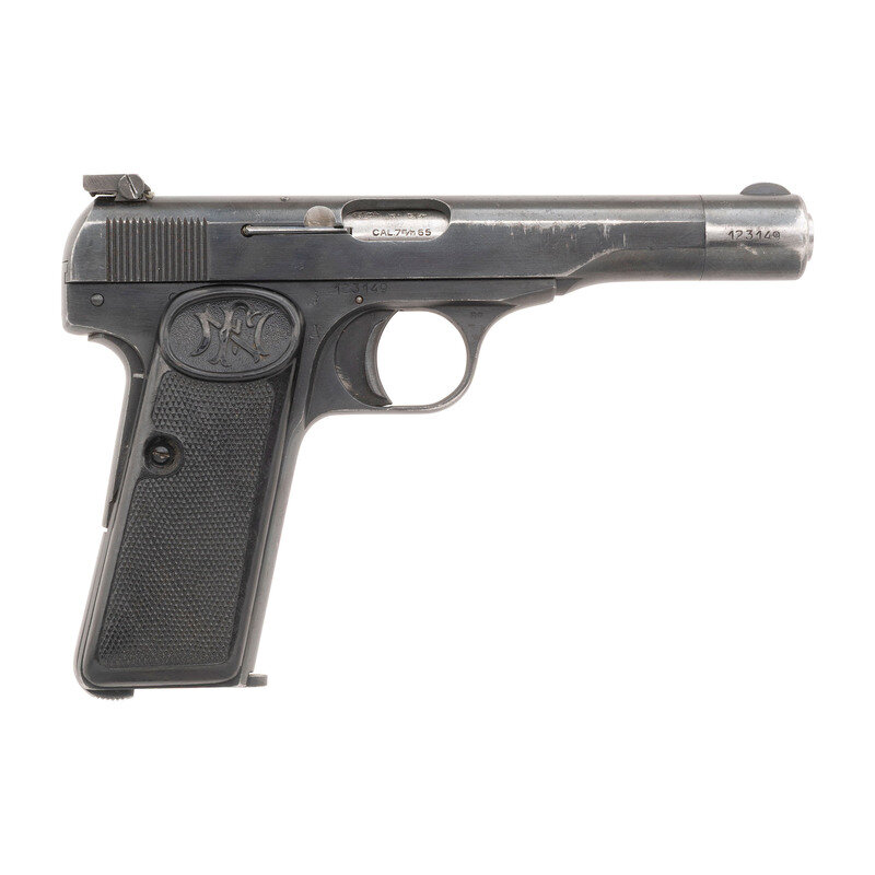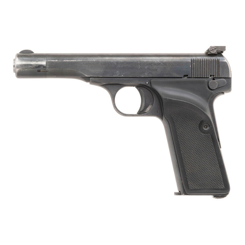 .32 ACP. 4.4" barrel length. SN: 123149. Blued metal finish with polished barrel mounting checkered FN logo right grip panel and replaced thumb rest left grip panel with white outline adjustable rear notch sight. Simple blowback operated striker fired autoloading pistol fed by detachable single stack magazines. Left slide legend reads FABRIQUE NATIONALE D'ARMES DE GUERRE HERSTAL BELGIQUE/BROWNING'S PATENT DEPOSE with Belgian firing proofs to the frame, slide, and barrel. Standard caliber mark to right barrel. Right frame additionally marked with A stamp below {Sunburst} and features additional B9 to the right triggerguard. These marks indicate it was once the property of the Berlin Police in the American Sector during the Cold War. Rear sight most likely installed at a later date, along with the replaced left grip panel. Serial numbers match on the frame, slide, barrel, and barrel bushing. Magazine is struck -F.N-/765m/m. {C&R}