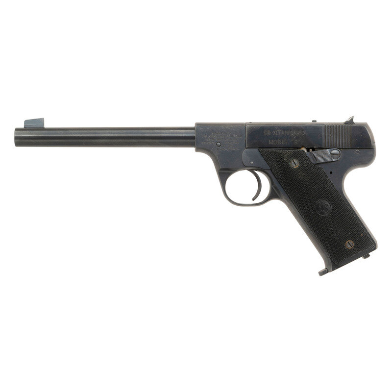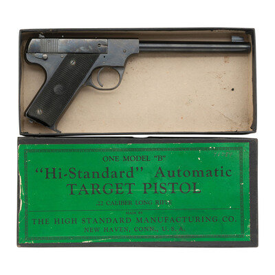 .22 LR. 6.75" barrel length. SN: 46084. Blued metal finish on slide and frame. Simple blowback operated internal hammer fired autoloading pistol fed by single stack detachable magazines. Fitted with fixed rear notch with matte front sight post and checkered synthetic grips marked HS. Item shows standard Hi-Standard 3-line address on left frame and HI-STANDARD MODEL "B" on left slide. Included is original box and instruction tag. {C&R}