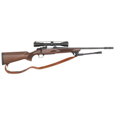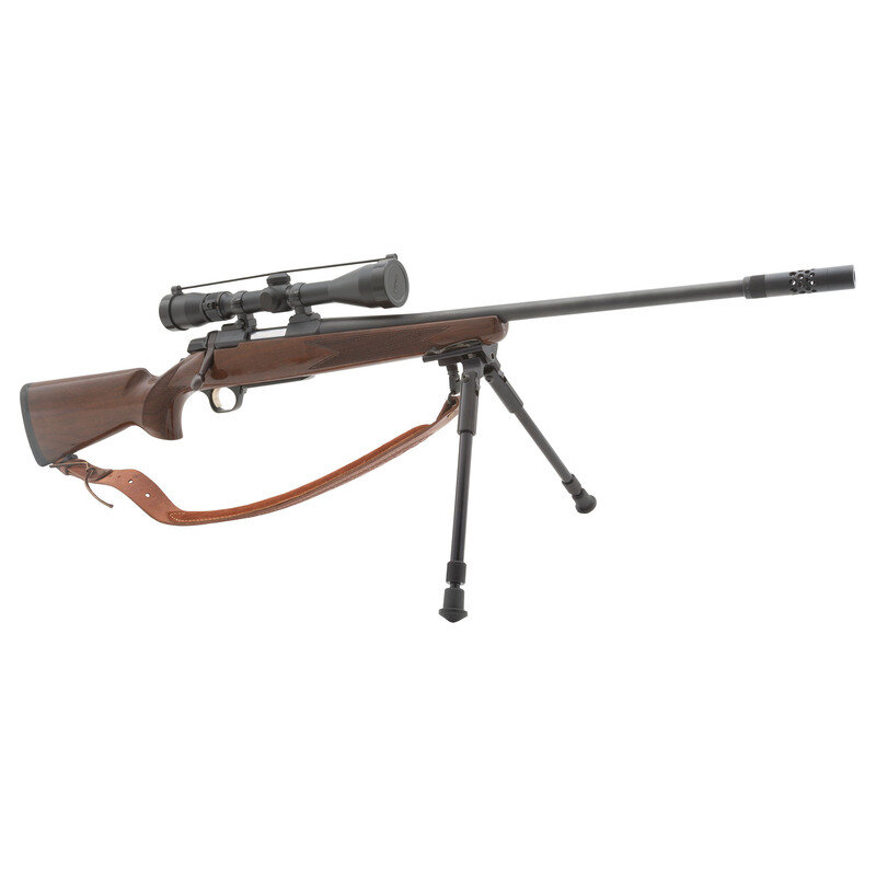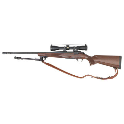 .308 Win. 23" barrel length. SN: 51717NV817. Bolt action rifle with walnut semi-pistol grip stock charged by internal magazine. Blued finish on frame and barrel with polished bolt and wood stock. Barrel stamped BROWNING ARMS COMPANY MORGAN, UTAH & MONTREAL P.Q./MADE IN JAPAN on left side and PAT. 4723369 A-BOLT CAL. .308 WIN ONLY stamped on right with compensator fitted to end of barrel. Stock features bordered checkering. Rifle is fitted with a leather sling attached via two sling swivels and a Nikon Buckmasters scope, along with bipod attached to stock of rifle. {MODERN}