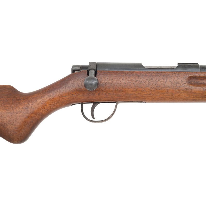 .22 LR. 25.5" barrel length. SN: 34531W. Blued metal refinish with polished bolt mounting a walnut semi-pistol grip stock with grasping grooves to forend. Bolt action single shot marksmanship training rifle mounting tangent rear notch and front blade sights. Receiver is dovetail cut for optic mounting. Markings include WALTHER banner to upper barrel followed by Gothic Sportmodell mark. Receiver marking reads Waffenfabrik Walther/Zella-Mehlis Thuringen. Right barrel shows a barrel gauge reading that is worn down by refinish with the receiver and barrel exhibiting commercial firing proofs including {Crown/B} and {Crown/U}. [C&R}