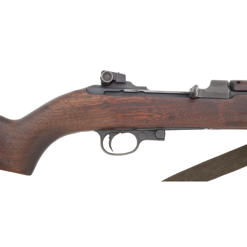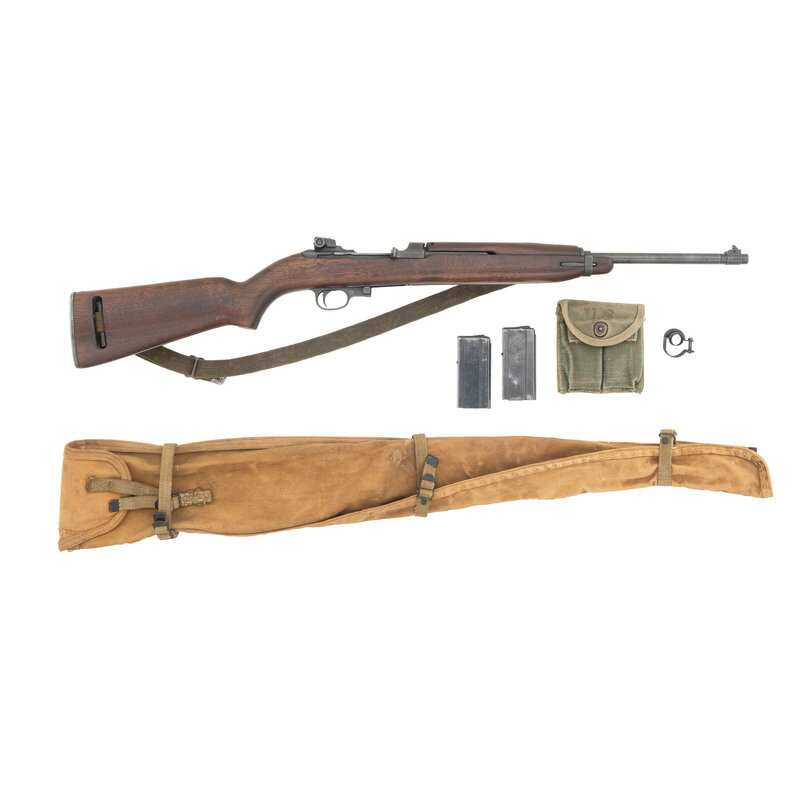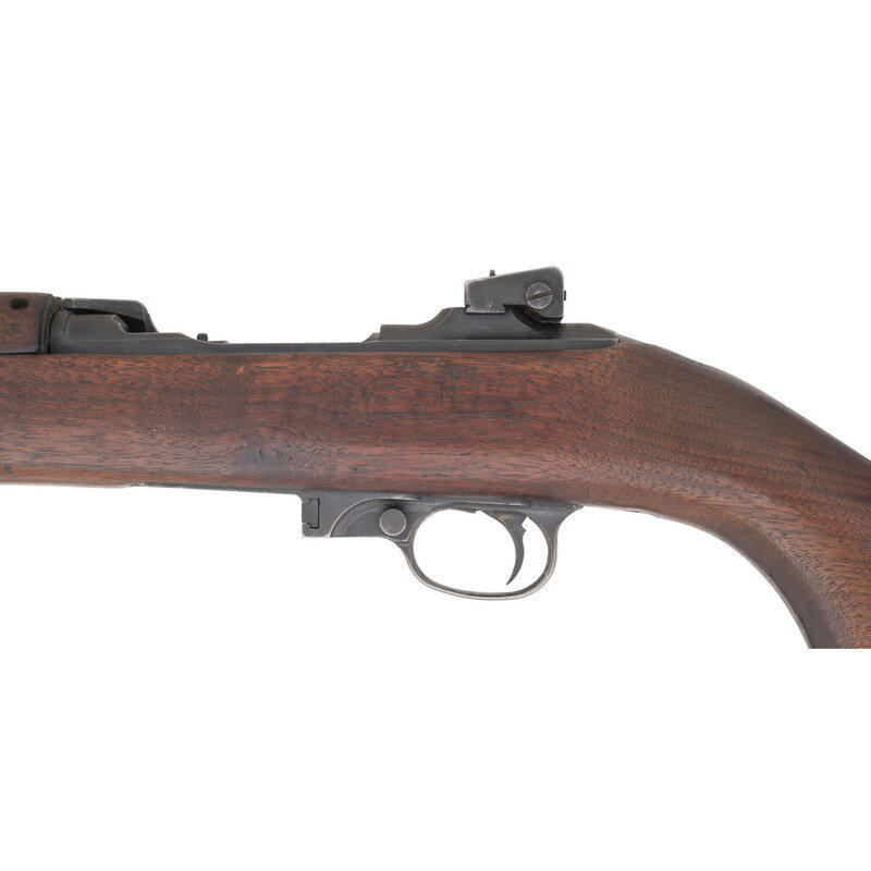 .30 Carbine. 17.75" barrel length. SN: 868530. Parkerized metal finish mounting walnut semi-pistol grip stock with two-rivet upper handguard and mounting customized sights. Short stroke piston driven gas-operated semi-automatic rifle fed by detachable double stack magazines. Item shows INLAND DIV manufacturer mark to the receiver with forward receiver displaying the model marking U.S. CARBINE/CAL. 30 M1. Item features a dished bolt with punch dot pressure proof marking, and a wartime Inland barrel with maker marking INLAND MFG. DIV./GENERAL MOTORS/11-43. A P prof is struck into the barrel forward of the gas block. Item features the crossbolt safety mechanism. Stock retains a weak RIA cartouche to the left side that has been sanded down. Sights consist of the later pattern adjustable rear notch and have been modified with the rear aperture cut into a V-notch and the front sight cut down into a front blade without protectors. Comes with a khaki canvas storage bag, a two-cell magazine pouch, an oiler, and a spare handguard retainer. Additionally comes with a total of two magazines. {C&R}