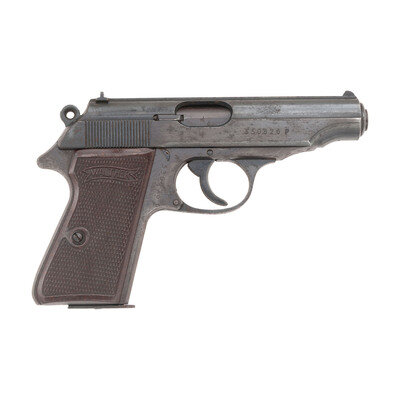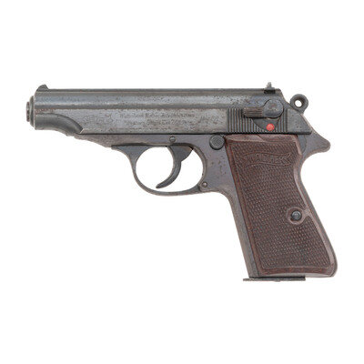 .32 ACP. 3.9" barrel length. SN: 330826p. Blued metal finish overall mounting checkered brown synthetic WALTHER banner grips and standard front blade and rear notch sights. Simple blowback operated DA/SA autoloading pistol fed by detachable single stack magazines. Left slide features the WALTHER banner with legend reading Waffenfabrik Walther, Zella-Mehlis (Thur)/Walther's Patent Cal. 7,65. m/m Mod. PP. Item shows {Eagle/N} proofs to the right muzzle and over the chamber. Finish shows rough machining typical of late war production. {C&R}