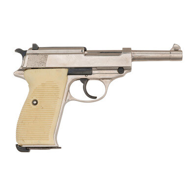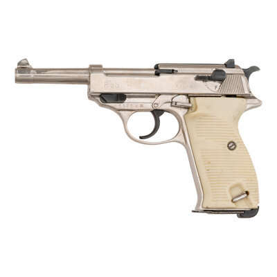 9mm. 4.9" barrel length. SN: 6329d. Nickel refinish with white synthetic Franzite grips and blued small parts mounting standard military pattern sights. Short recoil operated DA/SA autoloading pistol fed by detachable single stack magazines. Left slide shows the P.38 model mark followed by ac/43 code, indicating it was made by Walther in 1943. The frame, barrel, and locking block display the {Eagle/359} waffenamt, with the latter part additionally struck with the {WWII German Eagle} stamp. Comes with a blued WALTHER banner marked magazine. Waffenamt markings on the right slide have been filled in with the nickel refinish. {C&R}