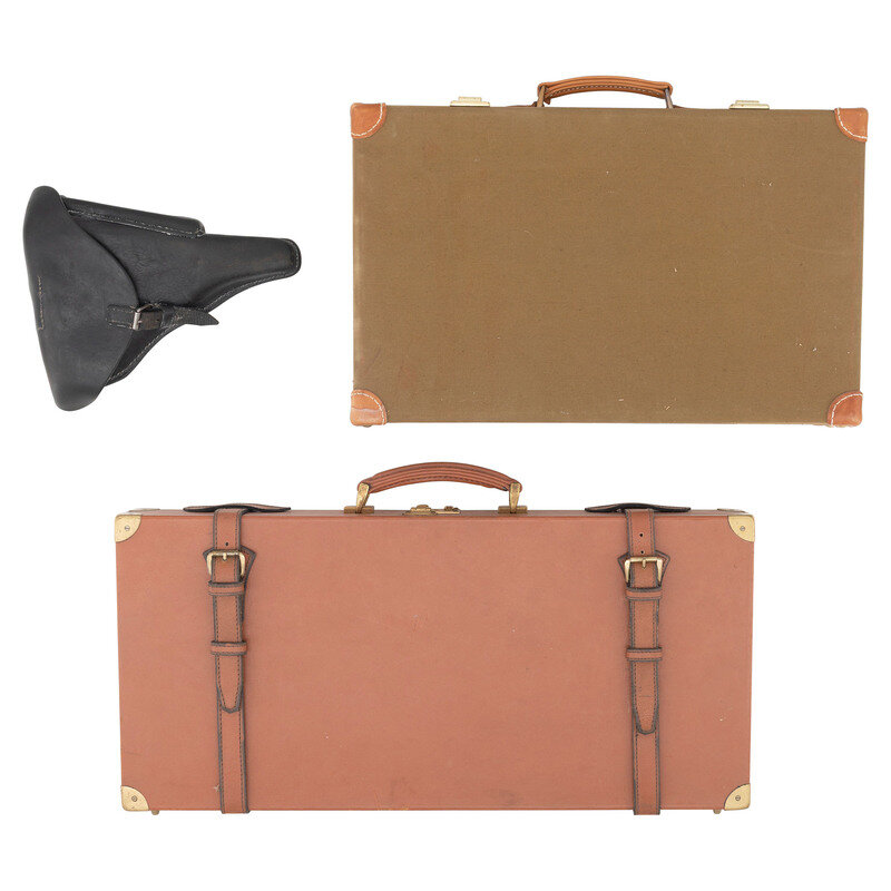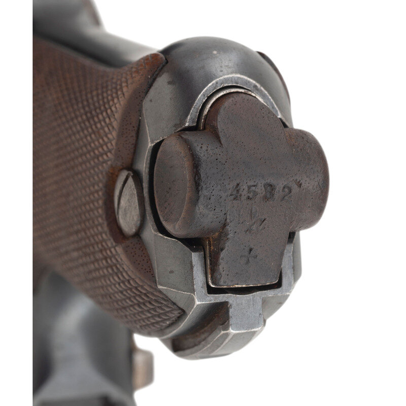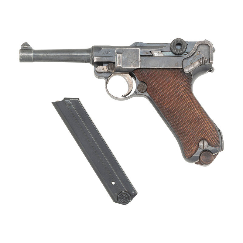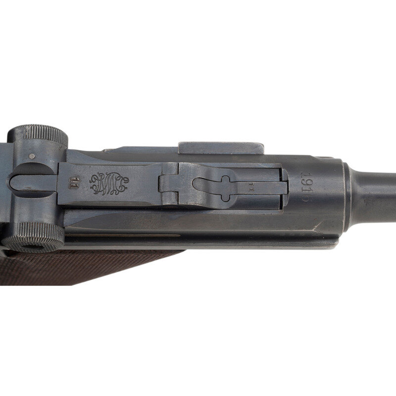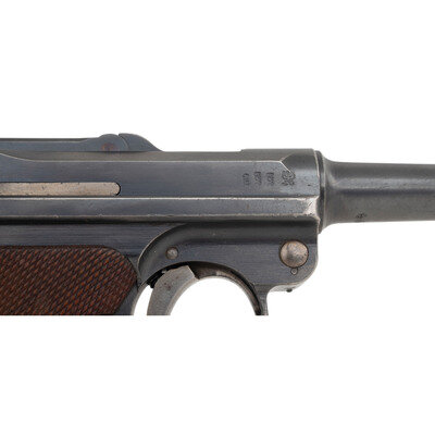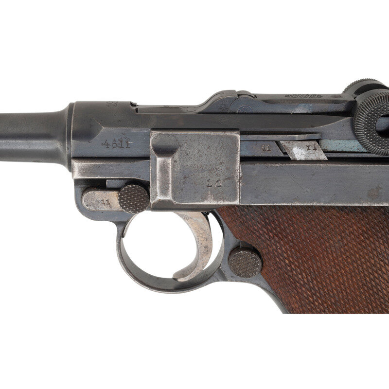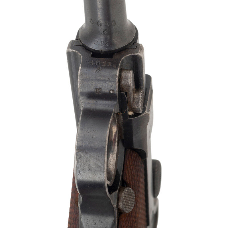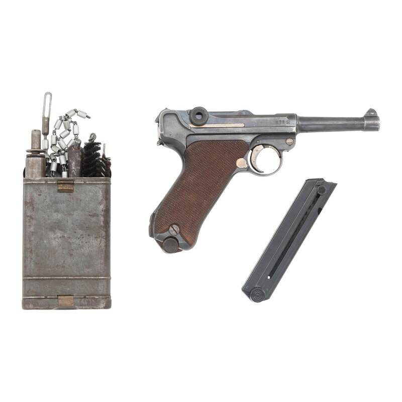9mm Para. 3.9" barrel length. SN: 4611b. Blued metal finish with straw colored trigger and Nitre blued small parts, and polished internal surfaces mounting checkered walnut grips and standard military pattern sights. Short recoil operated striker action autoloading pistol fed by detachable single stack magazines. Standard markings include DWM logo to toggle link and 1916 date to the forward slide. Further shows a GESICHERT safety marking on frame and GELADEN loaded indicator mark on the extractor. Serial numbers match on the handgun, but it comes with a non matching WWI period magazine with wood base plug and nickel finished body. Serial number to base plug reads 4532a followed by + sign indicating it was a spare. The breechblock, barrel, and slide are all struck with the WWI German {Reichsadler} marking, with the latter component also showing three Gothic letter inspection stamps. Letter K struck into the frame forward of the triggerguard. Barrel gauge reading of 8,82 struck into the lower surface. Item comes with a WWII pattern black leather holster with markings obscured by a riveted leather adapter allowing it to attach to an American Mills style belt. Additionally accompanied by a G.Appel/1938 marked K.98 rifle cleaning kit, Luger disassembly tool, and two custom gun cases. One case, possibly intended for a Luger carbine, features a Nizzoli maker mark, and a maroon velvet lining. The other case is canvas wrapped with leather corners, and appears to have been sized for a C.96 pistol. {C&R}