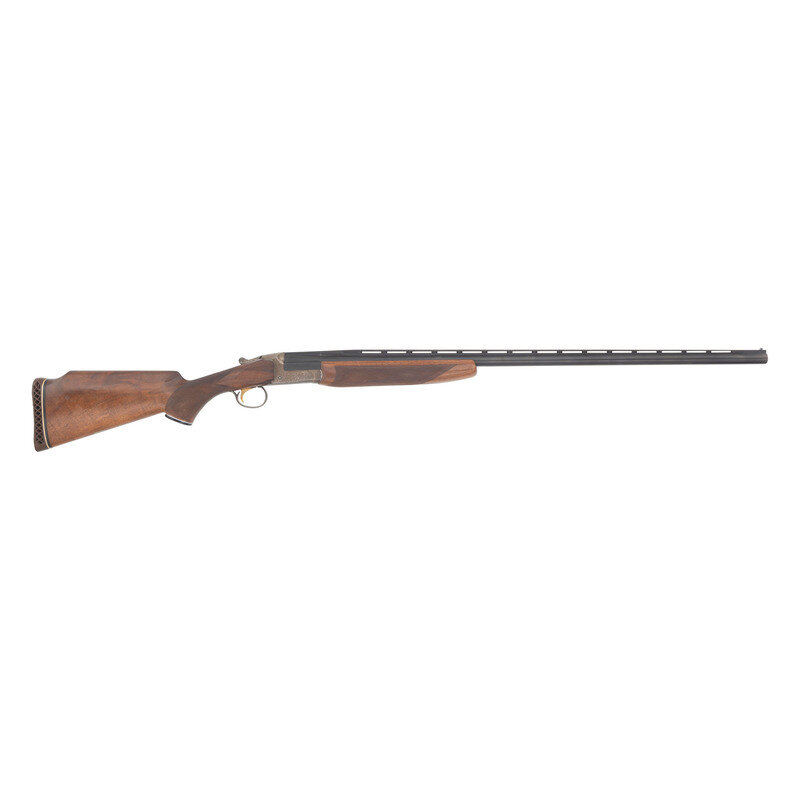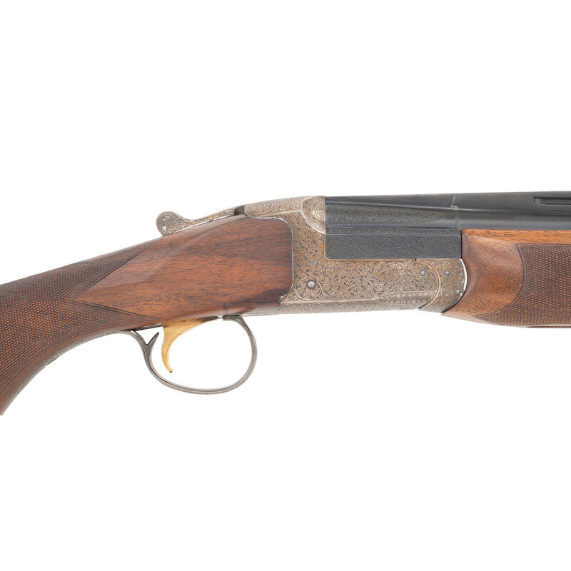 12ga. 2.75" chamber length. 34" barrel length. SN: S8801467. Single barrel break action boxlock shotgun with vented rib and pair of beaded sights. Blued metal finish on barrel with engraved silver finish frame and lever mounting wood pistol grip stock and forend. Stock features bordered checkering on pistol grip and flanks of forend with white spacers on bottom of pistol grip and rear of stock. Fitted with rubber recoil pad. {MODERN}