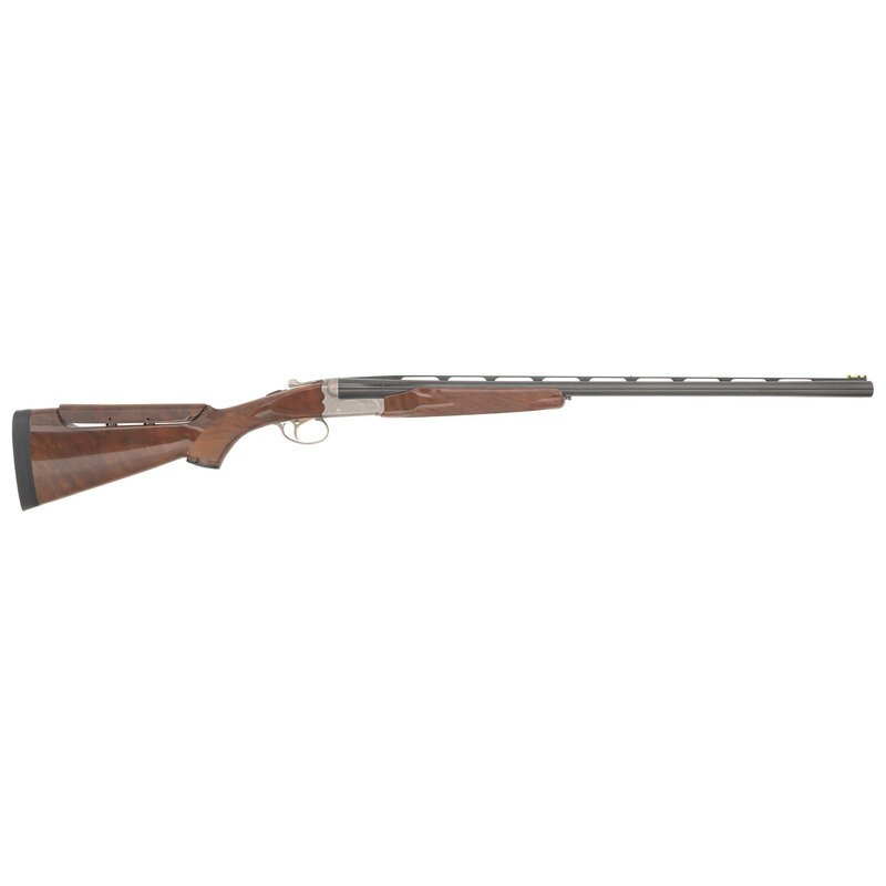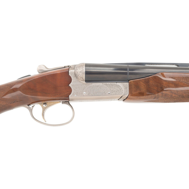 12 Gauge. 28" barrel length. SN: NS43629. 3" chamber length. Improved cylinder right and modified left interchangeable chokes. Blued metal finish with engraved silver frame mounting polished semi pistol grip stock with adjustable comb and forend. Double barrel side by side boxlock extractor shotgun featuring full length vented barrel rib mounting beaded sight and fiber optic front sight. Left barrel struck MODEL 385 12GA 3" CHAMBER PROOF TESTED/MADE BY NEW SKB ARMS COMPANY JAPAN on top and G.U. INC. OMAHA, NE on bottom right barrel underneath forend. Bordered checkering on semi pistol grip and forend. Stock features adjustable comb and rubber recoil pad. {MODERN}