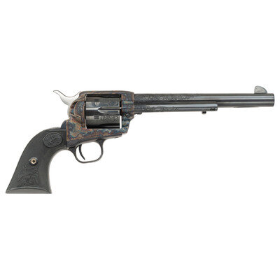 .45 Colt. 7.5" barrel. SN: SA07570. Blued metal finish with casehardened frame, polished hammer flanks, and checkered black synthetic Eagle Grips featuring engraved embellishments to the barrel, frame, and cylinder. Single action six-shot loading gate revolver mounting fixed front blade and topstrap notch sights. Standard markings include the three patents in two lines mark on left frame followed by {Rampant Colt} logo. The Triggerguard displays a crisp Colt VP monogram proof. Barrel address reads COLT'S PT. F.A. MFG. CO. HARTFORD, CT. U.S.A., with the left barrel marked COLT SINGLE ACTION ARMY .45 within an engraved banner. Item features foliate scroll engraving with beaded grounds over each chamber, on recoil shield, loading gate, rear frame, and on each flank of the barrel. Sunburst followed by foliate scroll flowing along the backstrap. Comes with a vinyl wrapped Colt case with gold coat of arms to lid over the motto VINCIT QUI PAITUR. Included with the revolver are a Colt congratulatory letter and Gun World magazine ad. {MODERN}