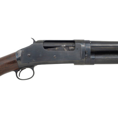 12 Gauge. 32" barrel length. SN: D416515. 2.75" chamber length. Full choke. Blued metal refinish overall mounting sanded and refinished round knob semi-pistol grip stock with corncob forend. Slide action repeating shotgun featuring brass bead front sight and WINCHESTER marked hardrubber buttplate. Standard markings including MODEL 1897/WINCHESTER to action bar and two-line address and patent to upper barrel. {C&R}