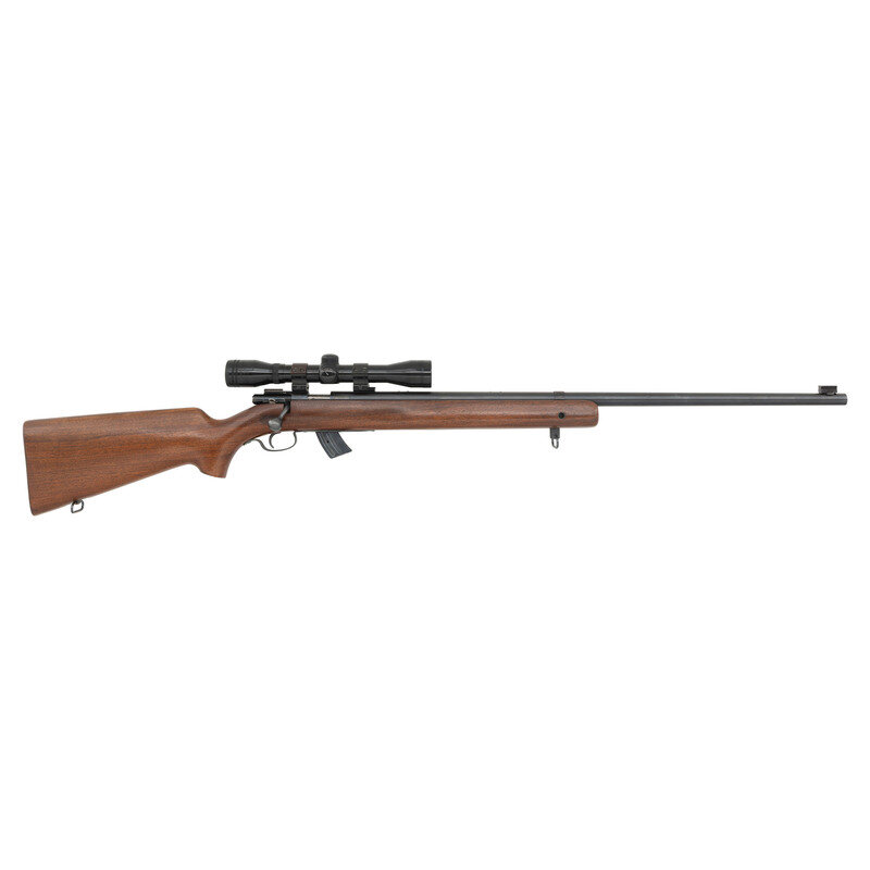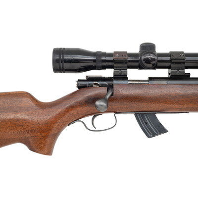 .22 LR. 28" barrel length. SN: 79247. Blued metal finish with polished bolt mounting walnut semi-pistol grip stock with front and rear sling loops, and sighted with a 4X32 tasco GOLDEN ANTLER telescopic sight. Bolt action detachable magazine fed repeating target rifle with stamped triggerguard. Standard make and model marks. Item features a mounting block for an aperture rear sight and tunnel front, but neither is provided with the rifle.{C&R}