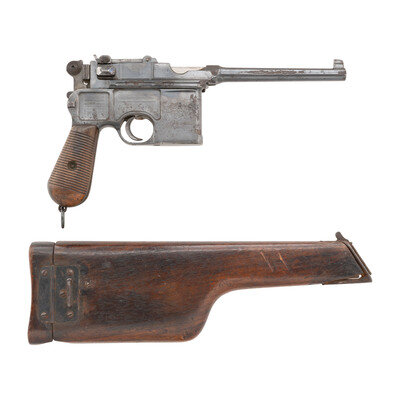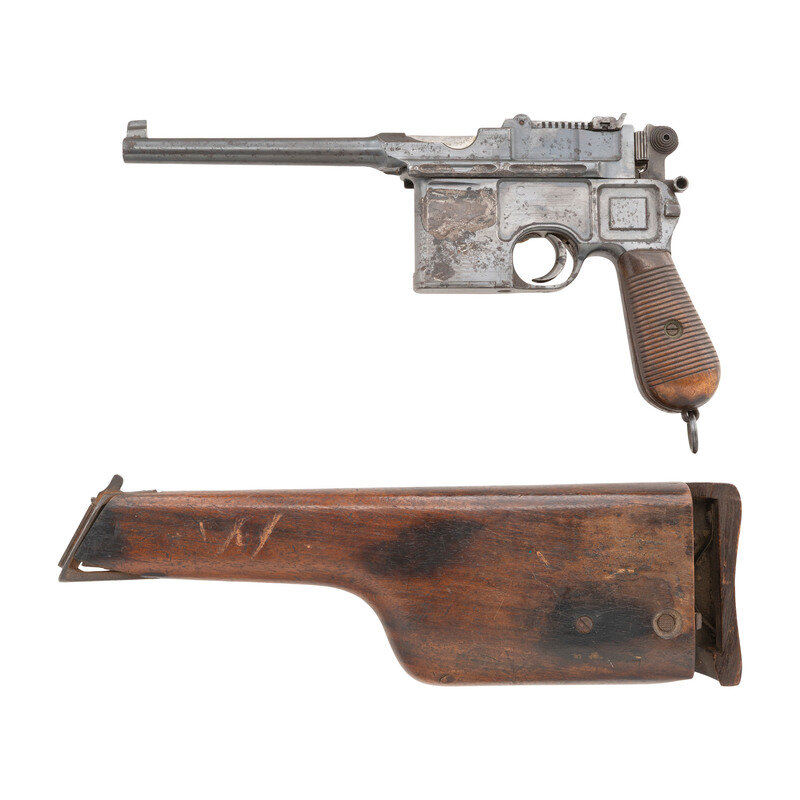 7.63x25mm. 5.5" barrel length. SN: 8636. (Mfg. ca 1897) Blued metal finish with straw and nitre blued small parts mounting horizontally serrated walnut two piece grips, and adjustable tangent rear notch and front blade sights. Short recoil operated single action autoloading pistol fed by an internal box magazine charged with stripper clips. Item features the early style cone hammer and firing pin retaining plate seen on antique Mauser pistols with a rear sight graduated from 50 to 500 meters. Upper barrel flat shows maker mark reading WAFFENFABRIK/MAUSER/OBERNDORF A/N, with further marks including the {Double Crown/U} to left barrel, and on lower bolt. Serial numbers match throughout, including on grip panels and firing pin. Pistol retains the lanyard loop to butt, and the stock mounting cut. Comes with an incomplete non matching buttstock/holster. Stock mounting bracket is numbered 10897. Stock is missing the screw for the mounting bracket, and half of the buttplate. {ANTIQUE}