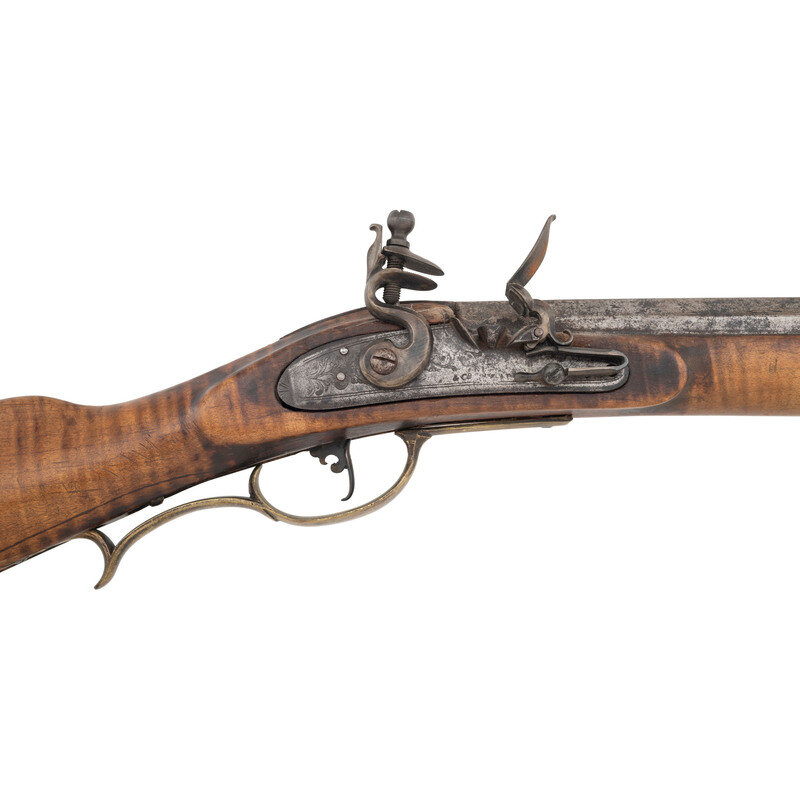 .44 Cal. 46.75" barrel length. NSN. Mottled gray to brown patina overall with casehardened pan, frizzen, and cock set in a maple full stock with brass mountings and endcap, and a cheek rest to left butt. Single shot flintlock rifle with octagonal barrel and mounting semi-buckhorn rear leaf sight without slider, and a dovetailed front post sight that is missing the post. Item shows weak maker marks on the barrel and lockplate, the latter with a legible & CO. marking. Features a waterproof pan with non-roller frizzen, the pan nicely aligning with the touch hole. Heavy barrel in excess of 1.125" diameter across the flats. This item measures 62" in length and 14 lbs. {ANTIQUE}