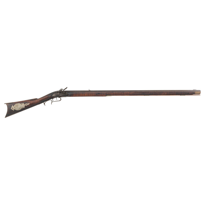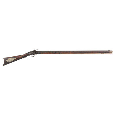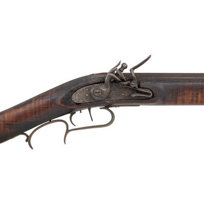 .36 Cal. 40.5" barrel length. SN: NSN. Browned finish with brass fittings, crescent butt, double set triggers, and mounting a full length maple stock with applied tiger stripe pattern. Single shot flintlock muzzle loading rifle mounting fixed semi-buckhorn rear and German Silver front blade sights. Barrel is signed H.D. ZIEGLER followed by P.O., for his Portsmouth, Ohio business. Lockplate has no extant maker marks but retains light border scrollwork and is engraved with a vignette of a hunter among the trees behind the cock. Right butt trapdoor is German Silver with floral engraved embellishments. Missing rear screw to brass counterplane. Most likely restocked. The touch hole aligns with the forward edge of the pan.