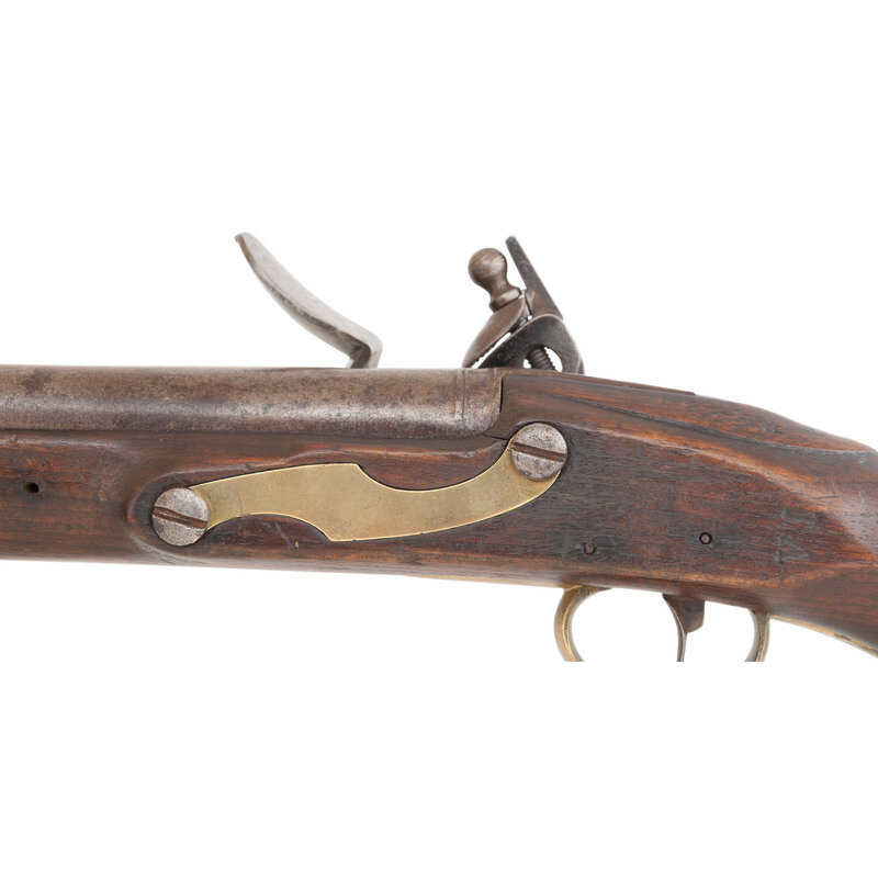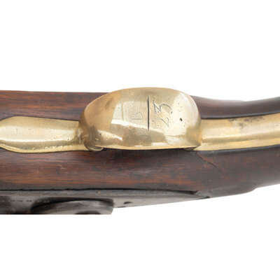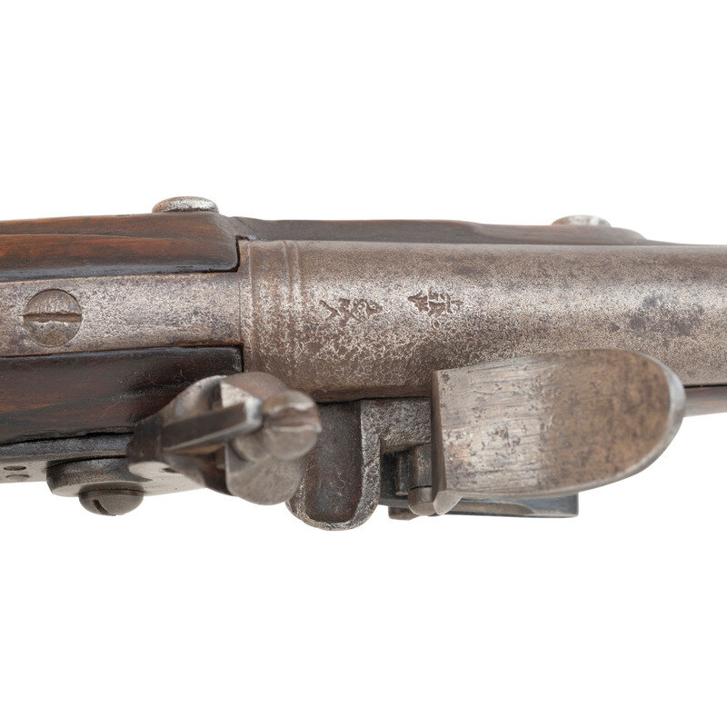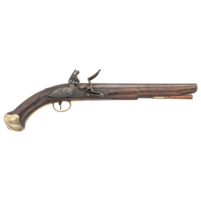 .67 caliber. 12" pinned barrel. NSN. Bright finish, brass furniture, walnut stock. Single shot flintlock muzzleloading smoothbore pistol made without sights. 5.5" flat short sear spring, post-1777 pattern lock with an and externally unbridled integral rounded and fenced iron pan and a flat reinforced cock. Lock is marked BARNETT under the pan and has a weak engraved date that appears to be 1761, although the first and last digits are almost illegible. Top of barrel with British Board of Ordnance proof marks, including a {CROWN}/GR/{BROAD ARROW} and {CROSSED SCEPTERS}. The bottom of the triggerguard is crudely engraved with the rack number B/23. A large VI is stamped into the counterpane of the pistol. Matching file slash mating marks are present on the bottom edge of the lock, in the ramrod channel of the stock and on the lower right edge of the barrel, below the touchhole. The overall form of the gun is a sort of strange combination of the Pattern 1703 style stock and 12" barrel with a later post-1750s flat "S" side plate and a post-1777 pattern lock. More than likely the pistol was assembled for service during the Napoleonic Wars period, when the need for small arms was extreme and the following of official patterns was somewhat less important than simply churning out functional firearms, particularly for use by Canadian militias during the War of 1812 period and for the use of other British colonial and partner forces. The lock date, in combination with the short sear spring, is somewhat incongruous, but may be an indication of reusing some older parts and bringing some features up to the new standards. Includes a modern wood ramrod that is secured by a single brass pipe.