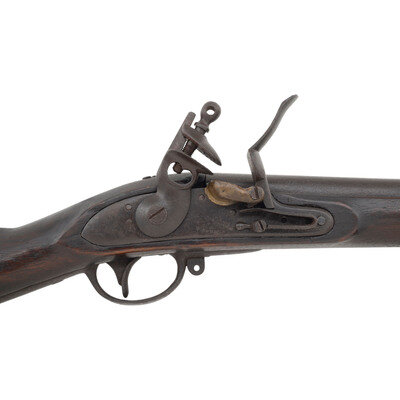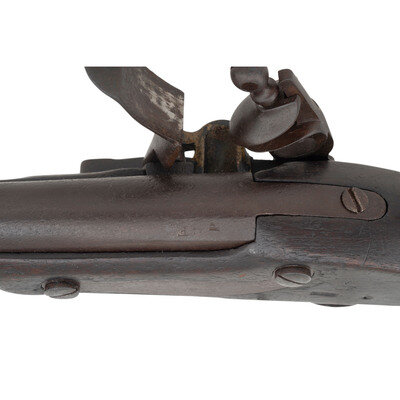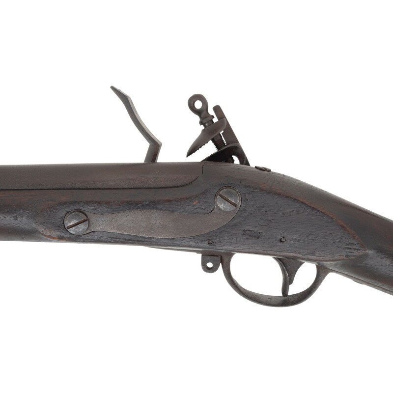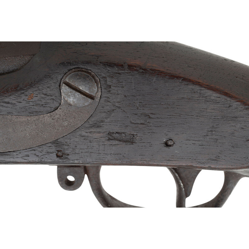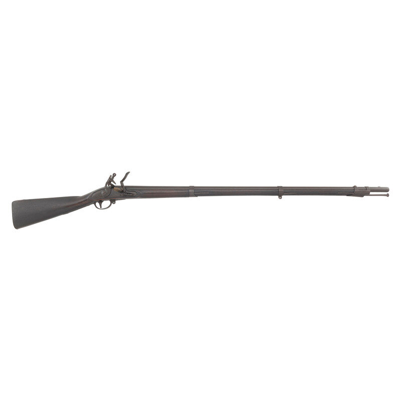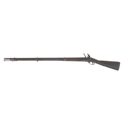 .69 caliber. 42" barrel. NSN. Heavily oxidized metal, iron furniture, full-length musket stock with three flat, spring retained barrel bands. Single shot flintlock muzzleloading smoothbore musket with no rear sight, brass blade front sight, missing the sling swivels and with a correct style button head ramrod. Lock marked M.T. WICKHAM in an arc over PHILA. Look remains in original flint. Endoscopic evaluation of the interior of the breech shows no signs of welding or reconversion. Touchhole is overly large, possibly due to erosion, and slightly forward of center. Breech with weak F and P inspection marks and counterpane with a V/GF inspection, the mark of arsenal sub-inspector George Flegel. Toe of stock with indistinct gang stamp markings that are probably New Jersey militia county ownership marks.