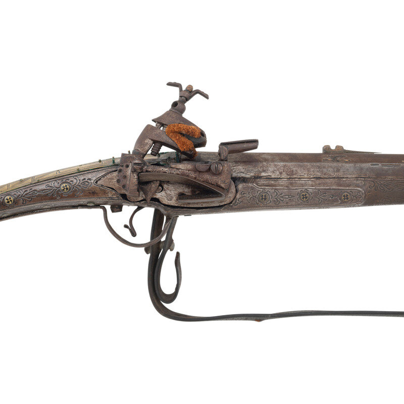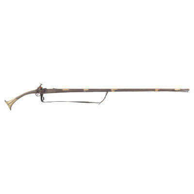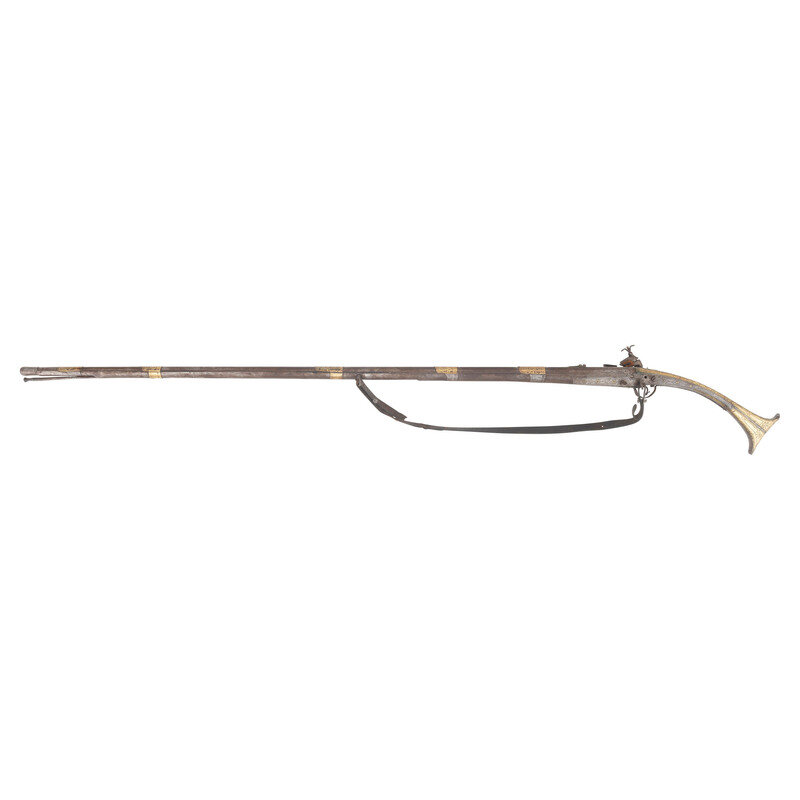 .60 caliber. 50.5" octagon to round barrel with swamped muzzle. NSN. Bright finish, iron and brass mountings, steel stock with traditional fish tail butt. Single shot miquelet lock muzzleloading smoothbore musket with fixed notch rear sight, no front sight, sling rings on the counterpane and reverse of forend. Traditional miquelet flint lock with grooved frizzen and external mainspring. Unmarked, decorated with traditional motifs and patterns that are both engraved in the metal and embossed on the brass barrel bands. An old leather sling is attached to the sling rings of the gun. A very attractive example.