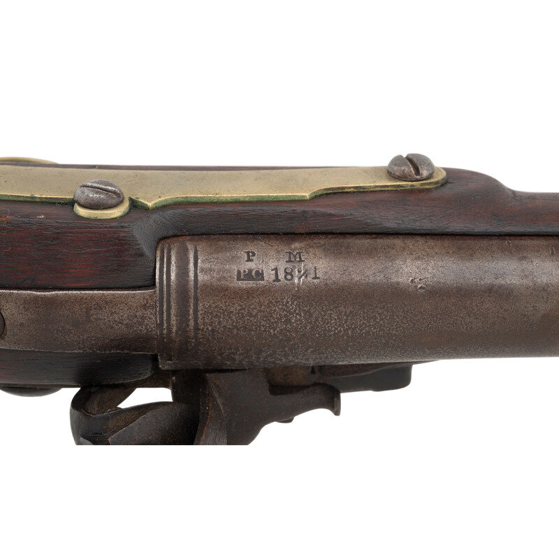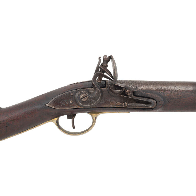 .69 caliber. 39" pinned barrel with baluster turned rings at breech. NSN. Bright finish, brass furniture, walnut stock. Single shot flintlock muzzleloading smoothbore dual purpose militia fowler musket with socket bayonet lug on top of barrel 1.25" from muzzle, no sights, three ramrod pipes and a button head steel ramrod. Externally unmarked flint lock with light floral engraving has an integral rounded and fenced, unbridled pan and a flat faceted swan neck cock. Lock remains in original flint and is marked KETLAND on the interior. It has matching mating marks are present on the lock plate, cock and frizzen. Breech marked M/1821 and P/PC. A classic example of a Brown Bess inspired New England dual purpose militia fowler from the early 1820s.