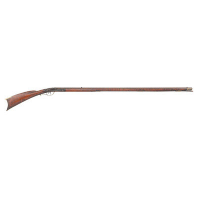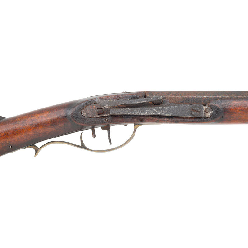 .45 caliber. 41" pinned octagonal barrel. NSN. Browned finish, brass furniture, faux-striped full-length hardwood stock with raised cheek rest. Muzzleloading smoothbore single shot "buck & ball" rifle with an adjustable trigger mule ear percussion lock, fixed notch rear sight and blade front sight. Lock unmarked and moderately pitted. Barrel with weak script signature that may be J B L. An interesting, somewhat crude and very light weight mid-19th century "smooth rifle". {ANTIQUE}