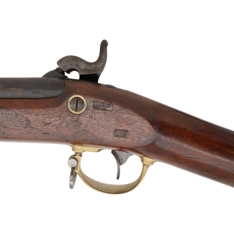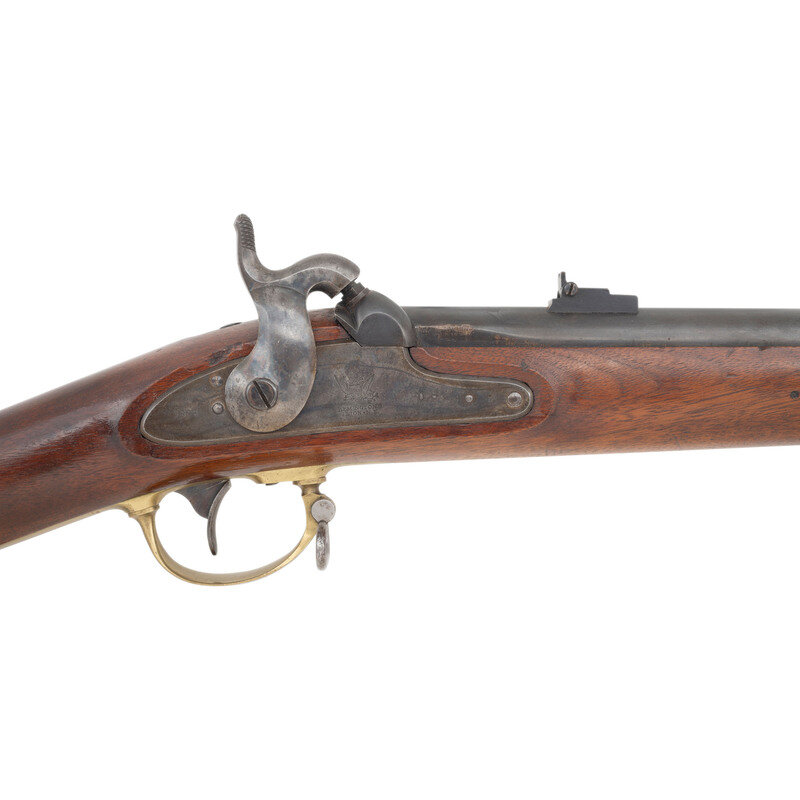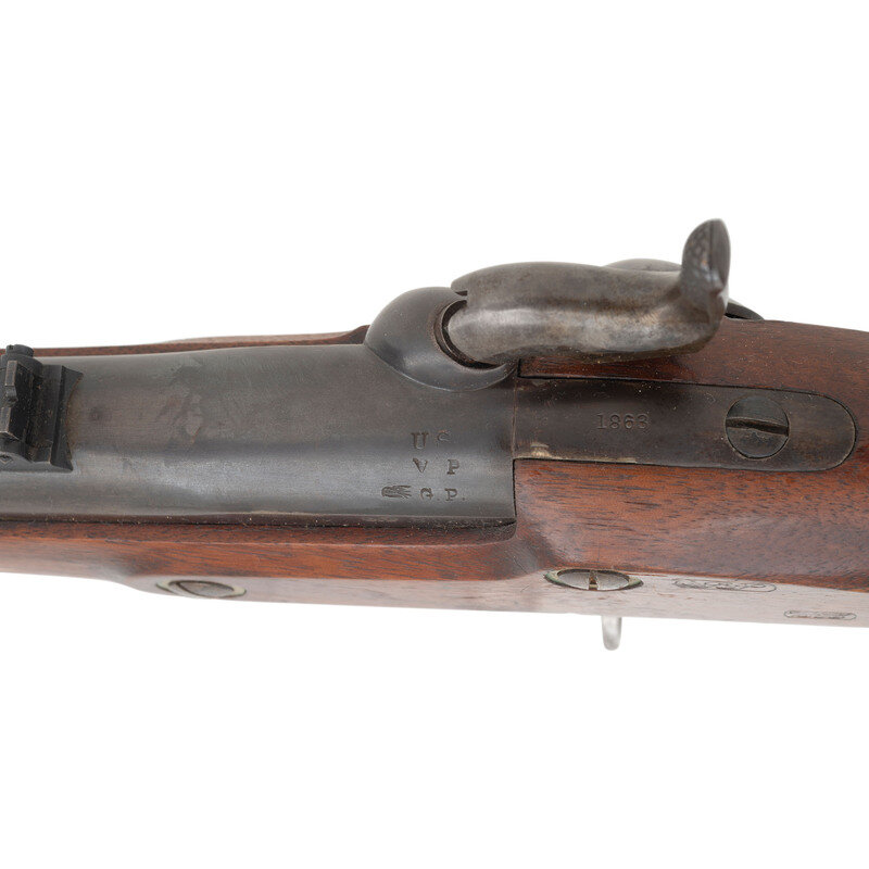 .58 caliber. 33" barrel. NSN. Blued finish, color casehardened lock and hammer, brass furniture, walnut stock with brass patchbox and two rounded brass spring-retained barrel bands. Single shot percussion muzzleloading military rifle with a hybrid pattern 1858/1861 three leaf rear sight, front sight blade, saber bayonet lug on right of barrel near muzzle, sling swivels and a tulip head, straight shank ramrod. Lock marked with a {Spread-Winged Eagle} and REMINGTON'S/ILION, NY forward of the hammer and dated 1863 at the tail. Breech with matching 1863 date and standard V/P/{Eagle Head} proof marks. Counterpane with correct script GP and BH cartouches. The Model 1862 Rifle was a simplified version of the Harpers Ferry M1855 Rifle, which omitted the Maynard automatic tape priming lock. Remington delivered 10,001 of the rifles under contract to the US Government between April of 1863 and January of 1864. However the guns were never issued. The guns remained in US arsenal storage, initially at Watervliet and later New York Arsenal until their sale to Francis Bannerman & Sons on August 8, 1907 for .$0.54 cents each, a far cry from the original contract price of $17 each, including the saber bayonet. These were probably the most aesthetically pleasing rifles to be produced for the US Ordnance Department during the American Civil War. {ANTIQUE}