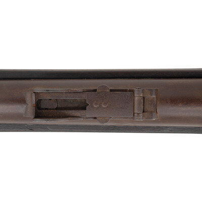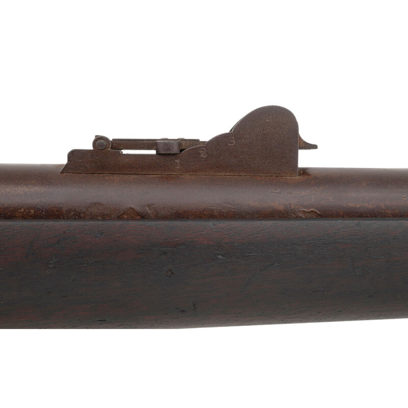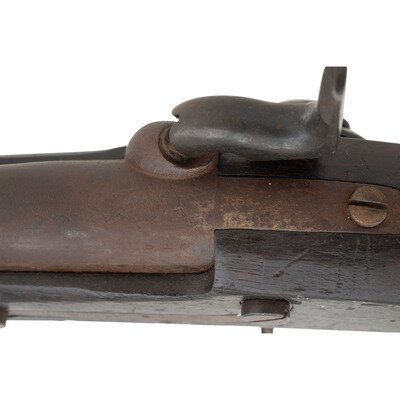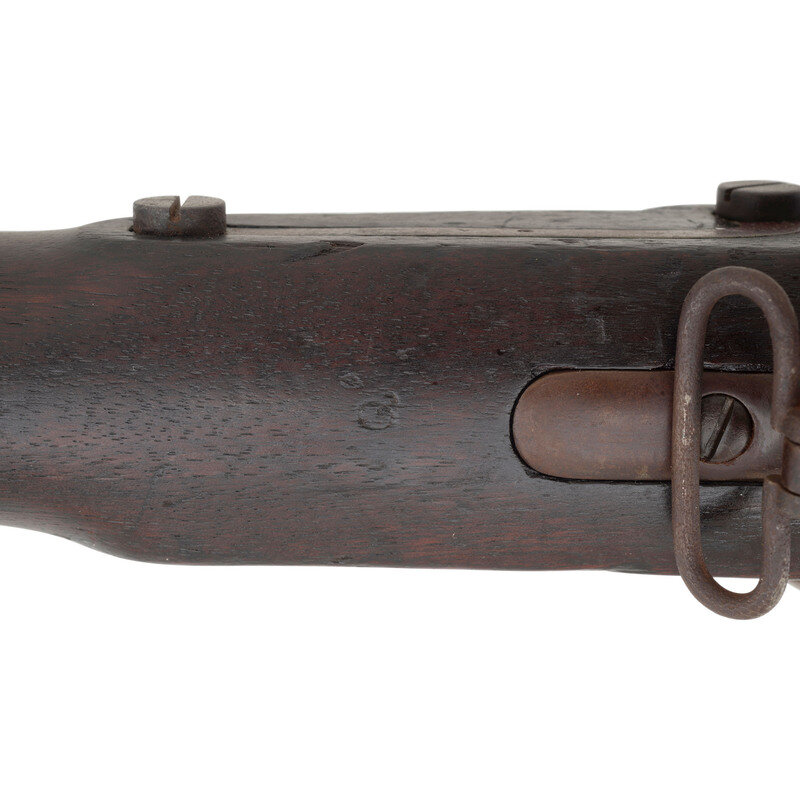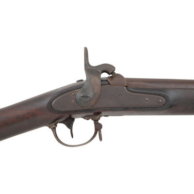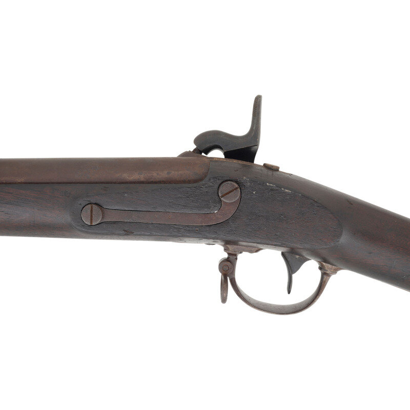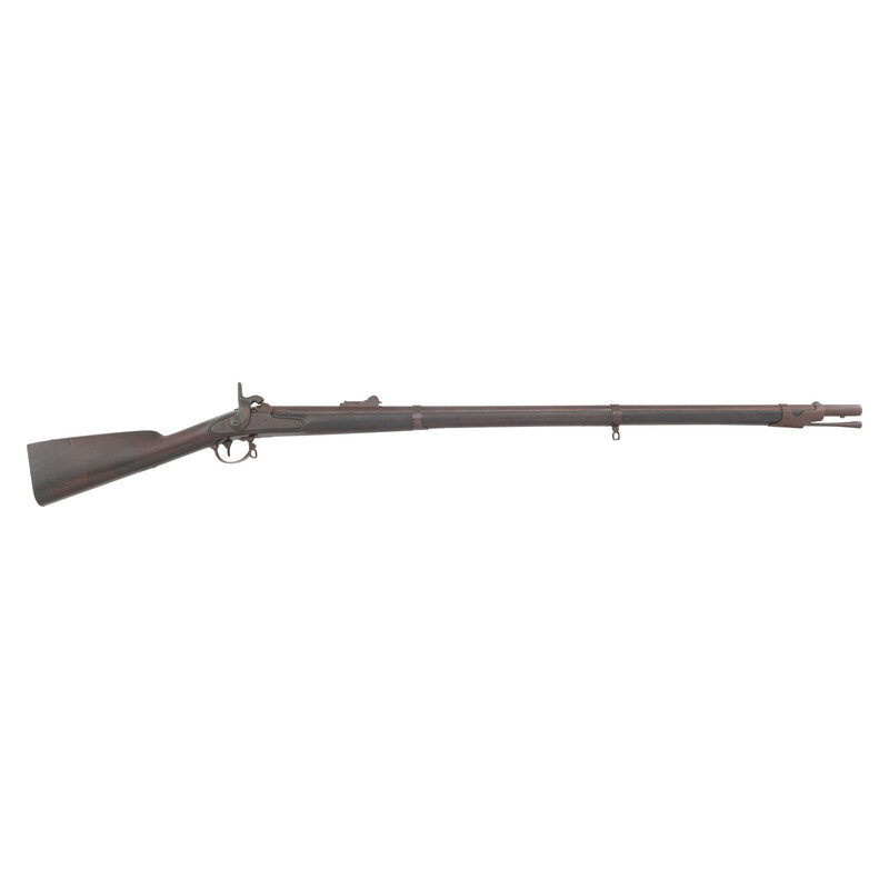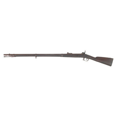 .69 caliber. 42" barrel. NSN. Heavily oxidized metal, steel furniture, full-length musket stock with three flat, spring-retained barrel bands. Single shot muzzleloading percussion musket later upgraded by riffling and sighting and then rebuilt by the Confederacy as part of their Cleaned & Repaired program. The lock is marked with the usual {Spread-Winged Eagle} over US forward of the hammer and in three vertical lines at the tail SPRING/FIELD/1848. The breech shows the usual V/P/{Eagle Head} proofs and the breech plug tang is dated 1853. A weak script JS cartouche is present on the counterpane and the Confederate re-inspection "C&R" mark "Q" is found in the wood forward of the triggerguard. Research printed in Steven Knott's book Captured & Collected - Confederate Reissued Firearms suggests that this mark was that of an unknown inspector at the Richmond Artillery Workshop, where thousands of guns captured and collected from battlefield were refurbished for reissue during the Civil War. The musket retains a correct pattern 1855 type long range rear sight from when the barrel was upgraded by rifling and sighting in the 1850s and the bore retains the three weak rifling grooves. The standard upgraded steel front sight blade is not present, although the correct cut in the barrel underneath the upper band is present. This cut was to accommodate the small rivet that reinforced the connection of the new sight to the upper band's forward strap. It is likely that the current barrel band with a standard smoothbore brass blade front sight was installed during the Confederate rebuilding of the gun. Otherwise the gun retains both sling swivels and an original ramrod that is not cupped for elongated ball, again likely replaced at the time of the southern refurbishment. A neat example of a Confederate rebuilt US musket that likely took the field again to fight after it was rebuilt.