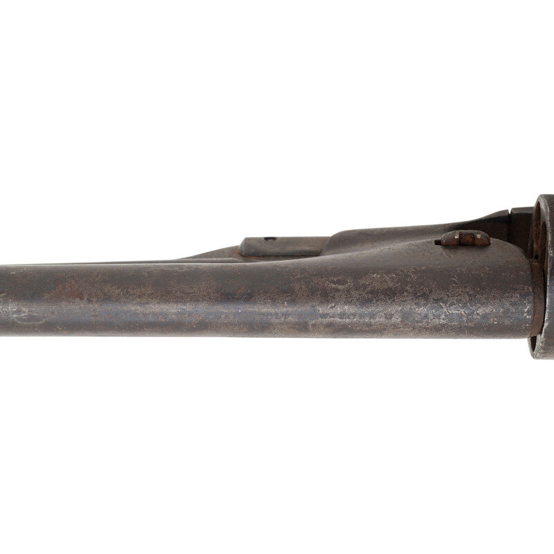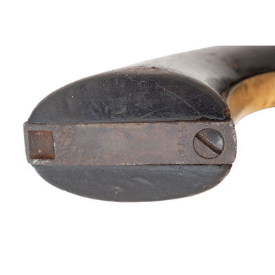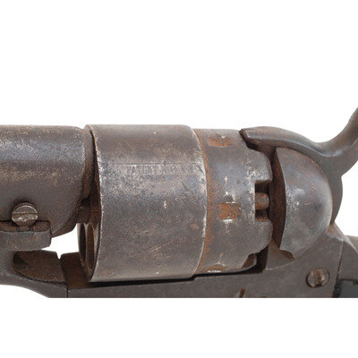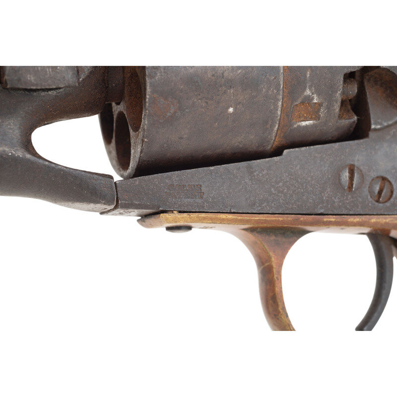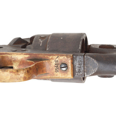 .44 caliber. 8" barrel. SN: 58745 (mfg. ca. 1862). Blued and color casehardened finish, brass triggerguard, smooth one-piece walnut grip. Single action percussion revolver with six-chambered unfluted rebated cylinder, three-screw frame cut for stock, hammer nose notch rear sight and German silver blade front sight. One line "New-York U.S. America" address on barrel, two-line "Colt's Patent" mark on frame. All visible serial numbers match, cylinder number not legible, wedge mismatched. Cylinder essentially no scene remaining and weak markings. Traces of a cartouche are present on the right side of the grip.