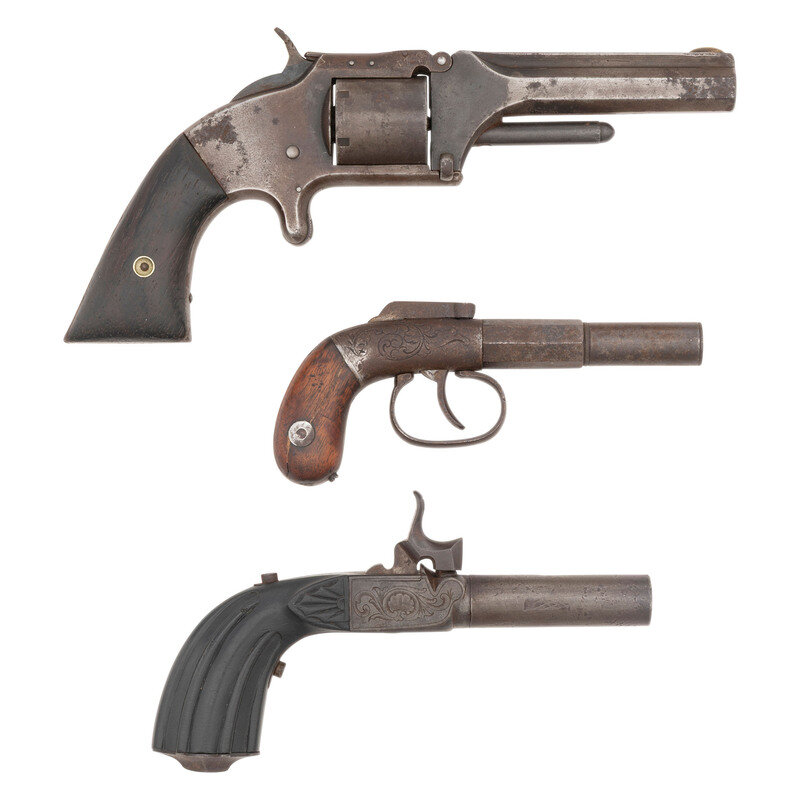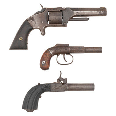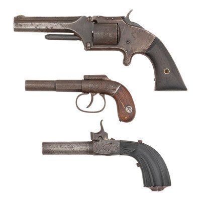 3 Antique Pistols: S&W No 2 Revolver, Manhattan Bar Hamer Single Shot, Continental Percussion Single Shot Pocket Pistol