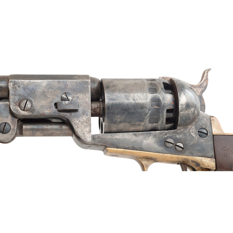 .36 caliber. 7.5" octagon to round barrel. SN: 825. Blued and color casehardened finish, brass backstrap and triggerguard, smooth one-piece wood grip. Single action percussion revolver with six-chambered unfluted cylinder, hammer nose notch rear sight and brass cone front sight. An apparent Italian reproduction of a Colt M1851 Navy altered to appear like a Confederate Augusta Arsenal revolver with six addition cylinder stop slots added to the cylinder to create twelve, which was one of the features of the Augusta revolvers. Top flat of barrel stamped AUGUSTA GA. Machine work is crude, particularly on the stop slots and in re-profiling parts of the frame and barrel. Strong remnants of the reproduction revolver's original roll engraved scene remain on the cylinder. A neat option for the reenactor who wants to have a less common Confederate revolver as part of his impression.