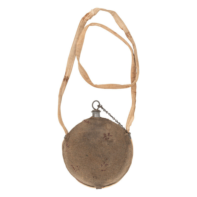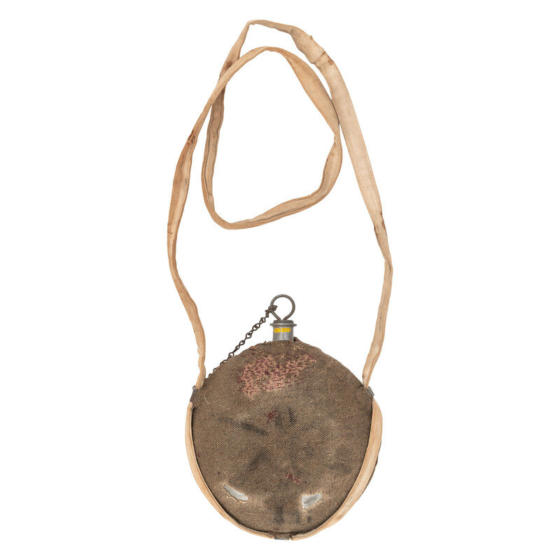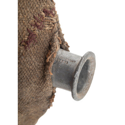 US Model 1858 "Smooth Side" Canteen with the pewter spout maker marked J.C. JOHNSON & Co/FEB 5. 65. Nominally 8" in diameter with a tinned sheet iron smooth oblate spheroid body. Retains what appears to be the original mousy grayish-brown jean cloth covering, typical of late war New York Depot canteens, with some old period of use repairs. Also retains a well worn folded and sewn cotton drill sling that appears to be original to the canteen with worn traces of an inspector's mark stamped on it. Includes what is probably the original period New York Depot stopper with jack chain secured to a small hole punched in one of the upper sling loops. The New York Depot received 100,000 of these "smooth side" canteens from New York hardware merchant John C. Johnson, from a February 4, 1865 contract at the rate of .66 cents each. They were all delivered very late into the war and most were likely unissued prior to the cessation of hostilities.