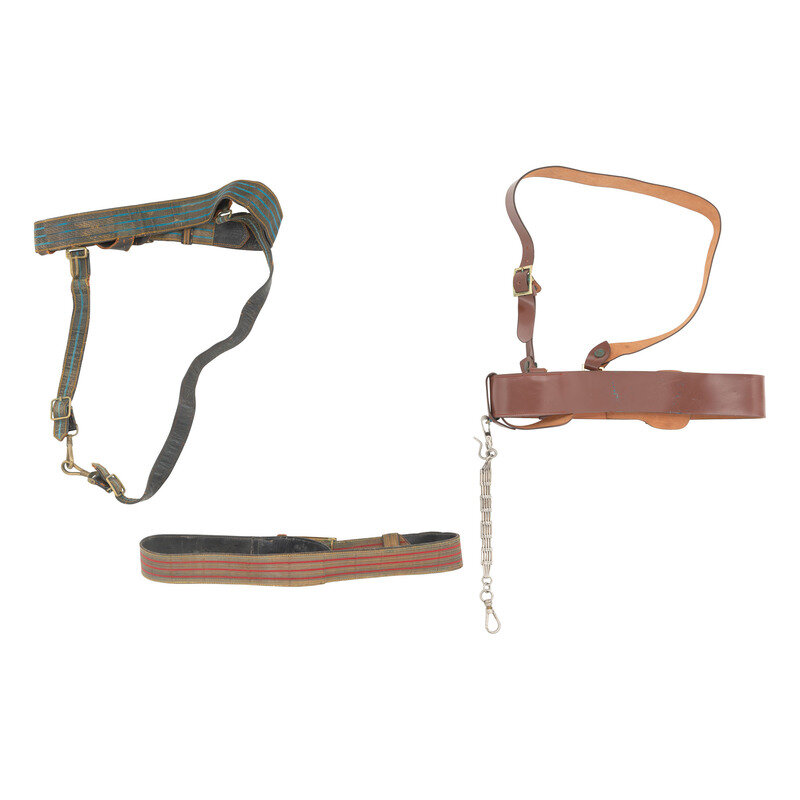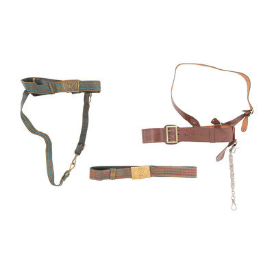 1.) Sam Browne Belt with nickel silver sword hangar, a size 36 shoulder strap, and size 34 belt. Maker mark to the belt reads DEHNER'S/OMAHA, with a nearby retailer sticker for Bravo & McKeegan/Stockton, Calif. Sword hangar loop is stamped SOLID/NICKEL SILVER/RUSTPROOF.