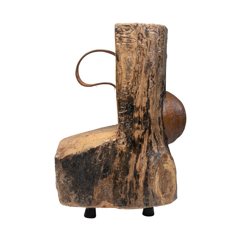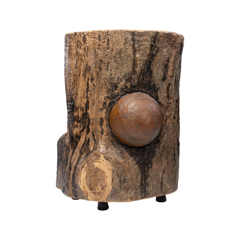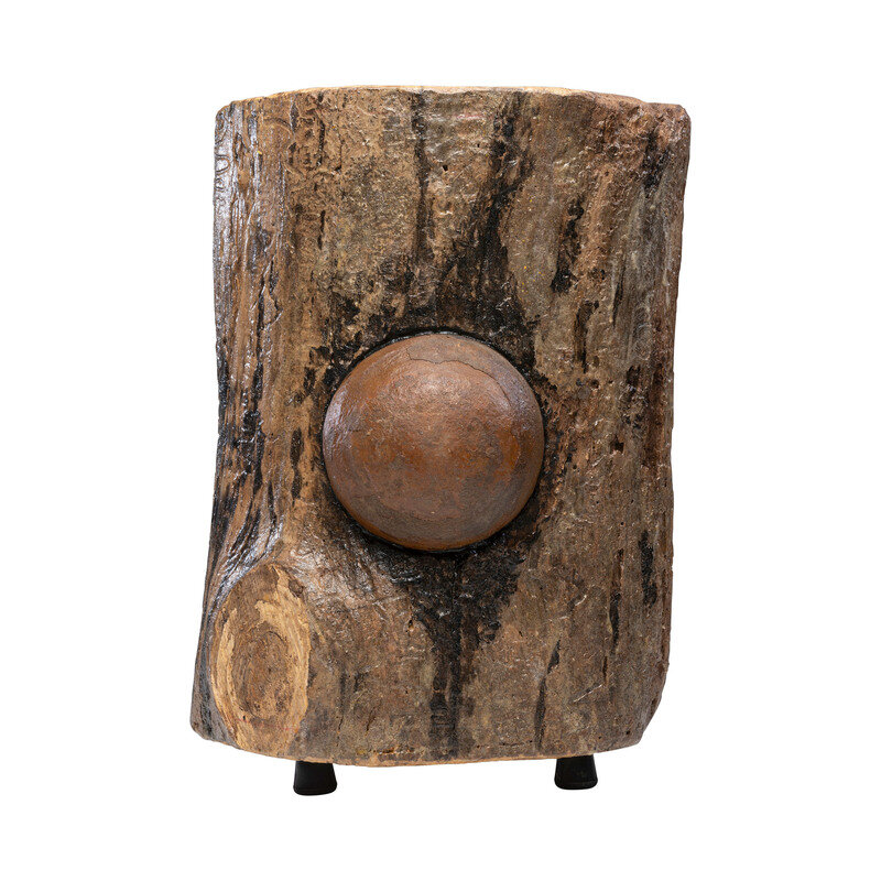 Nominally 20.5" tall by 14.5" wide, with four rubber feet on the bottom and a leather carrying strap attached to the rear upper portion of the log that has been cut away. Face of log has a nominally 6.25" diameter "cannonball" which is non-ferrous and will not attract a magnet, indicating it is not iron. The diameter is slightly larger than any standard Civil War era field artillery bore diameters and is appropriate for a 32 pound gun. The log was likely assembled as a decorative item and has a coating of varnish or polyurethane on it to protect it. Overall weight is about 42 pounds. A good looking "War Log" that would be a nice decorative accent piece in a room that is Civil War themed, or as an addition to your "gun room".