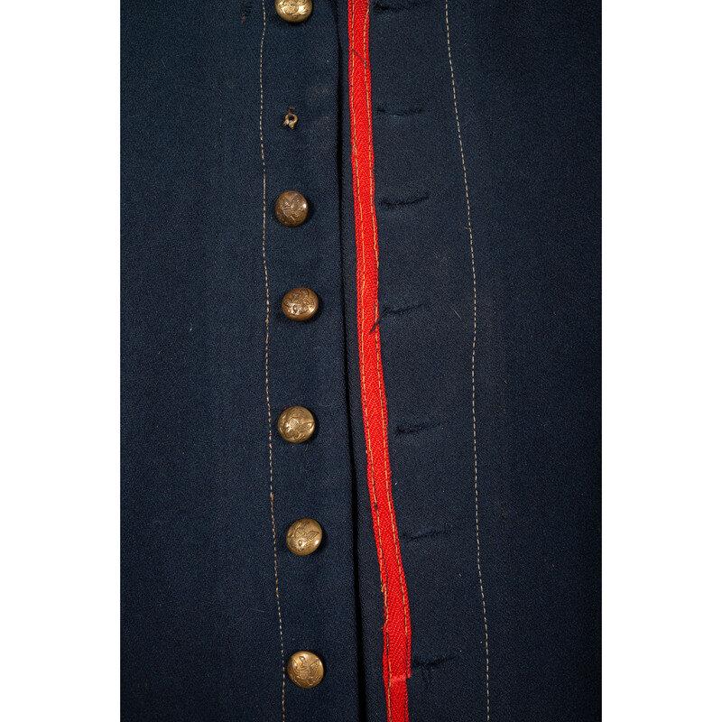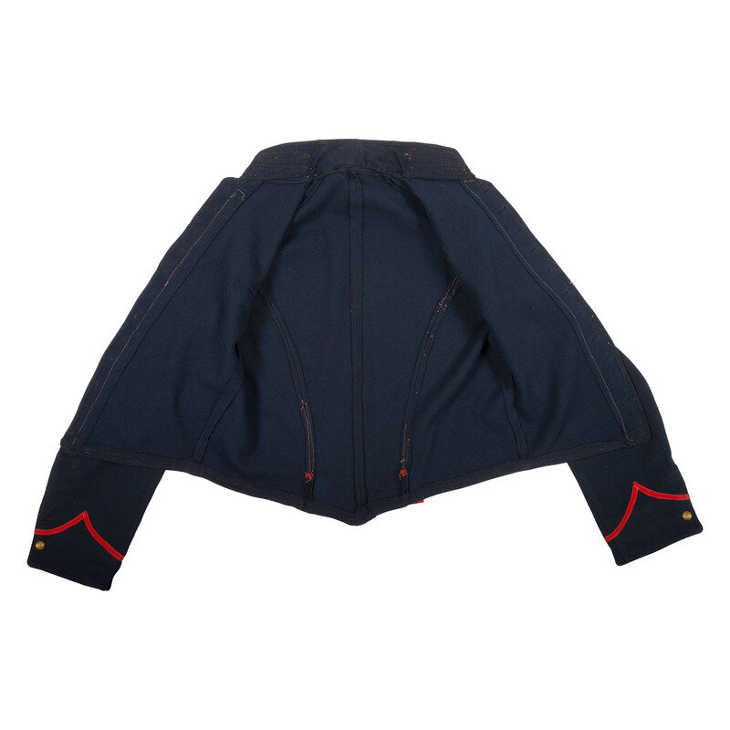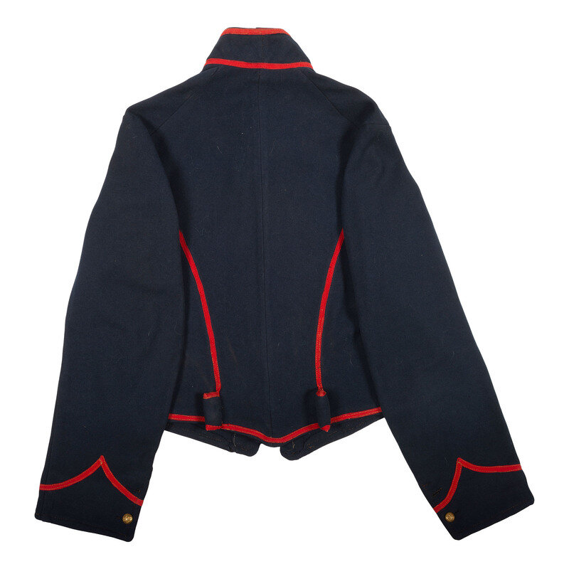 US Pattern 1858 Mounted Services Jacket made from indigo dyed blue wool broadcloth with no lining remaining and slightly faded red branch of service herringbone pattern tape trim. Jacket features five-piece construction with a 2.25" standing collar with four buttons, a twelve button front that is missing one button, belt support pillows on the rear and functional two-button cuffs with one button missing from each cuff. The hook and eye closure at the neck is missing. Buttons are cuff sized general service eagles.
