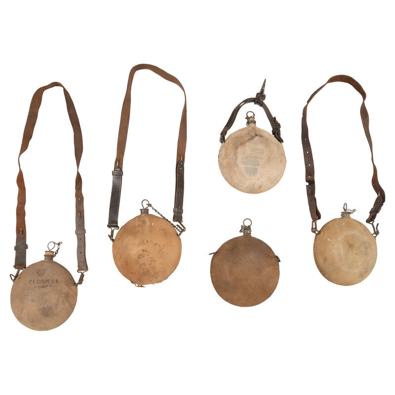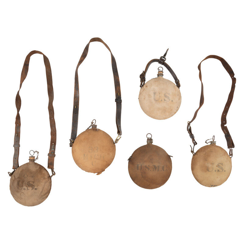 Lot of five canteens, all with canvas covers, triangular sling keepers, pewter spouts, and cork stoppers. All but one retain their leather slings. Four of them show US markings, three are stamped, and the fourth appears to have been reapplied with a fountain pen. The fifth example without sling has U.S.M.C. marked cover, indicating Marine Corps issue.