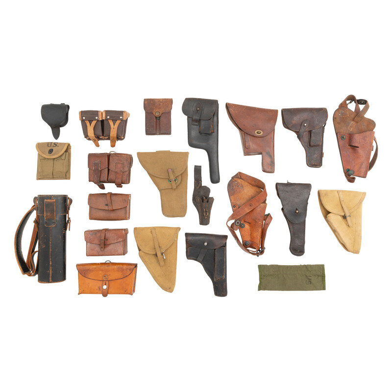 Mixed lot of WWI and WWII holsters including leather C96 holster, two Canadian Hi-Power holsters, along with American, German, and Chinese examples. Also included are a mixture of cartridge boxes and magazine pouches including 1917 dated two-cell 1911 pouch, along with French, Soviet, and Swiss pouches.