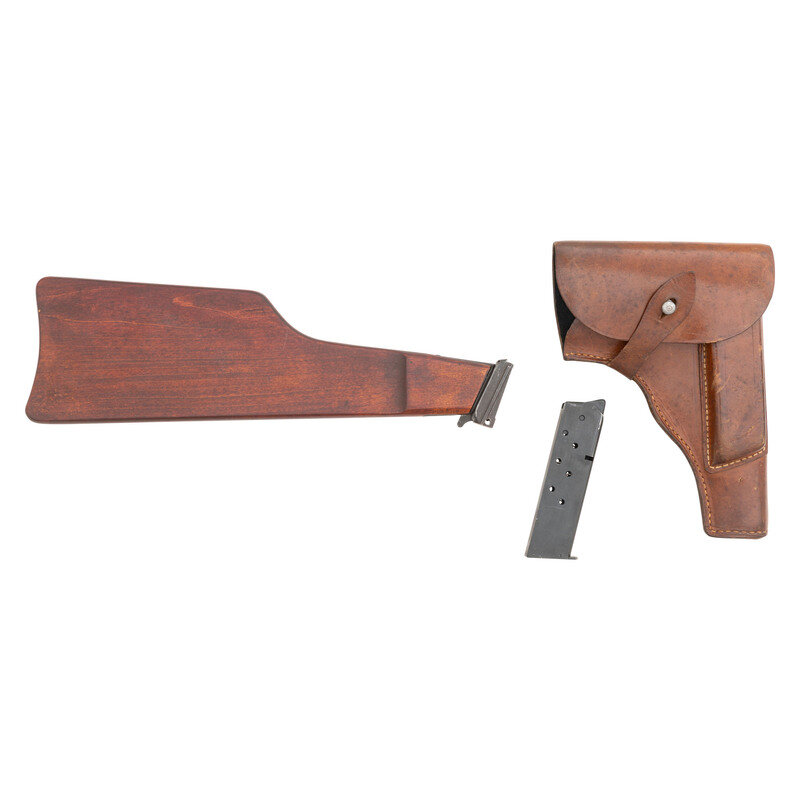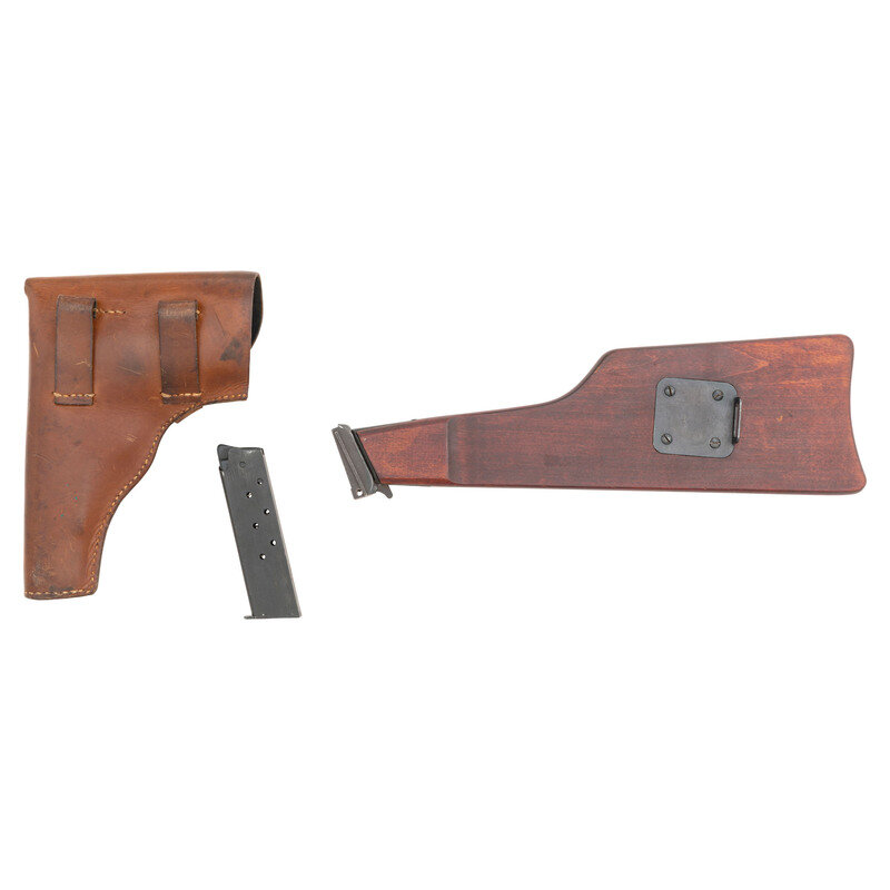 Lot includes one leather flap holster with the inner flap marked bnz/P 35 (b) flanked by the {WWII German Eagle}. Features an intact tie down strap and a blued and unmarked Viz. 35 pattern magazine. Lot also includes one Viz. 35 backstrap featuring the stock mounting cut and showing rough wartime finish, and one post-war shoulder board stock with blued fittings.