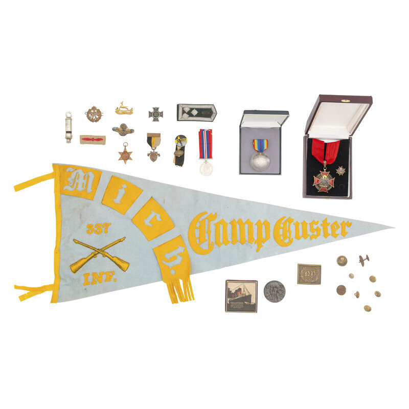 Lot includes the Spanish Order of Cisneros medal and button in original box, a "Lusitania Medal" in box, 1916 dated J. HUDSON & CO. trench whistle, German WWI Cross of Honor, British WWII Victory Medal, RAF pin, 1939-1945 Star, and more. Additionally comes with a felt banner for Camp Custer, Michigan.