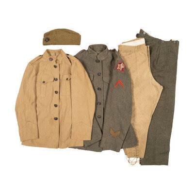 Lot includes a matching United States Marine Corps wool tunic and trousers, the tunic mounting the {Indian Head/Red Diamond} for the 5th Regiment 1st Battalion. This tunic features the iconic deep green color of uniforms made expressly for the Marine Corps, and lacks the later collar buttons that the Marines adopted to help distinguish their uniforms from the Army when they were compelled to adopt the 1917 tunic. Also included are a khaki canvas tunic and trousers featuring one intact Marine Corps {Eagle, Globe, and Anchor} collar button, and mounting {Eagle/Anchor} buttons down the front. Finally, the lot includes one OD green wool garrison cap with USMC button.