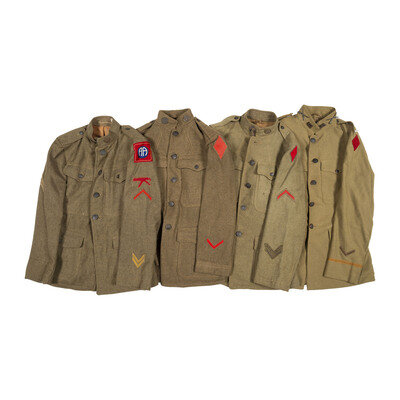 Lot includes one 5th Infantry Division marked officer's tunic with Lieutenant's bars. The remaining 5th Infantry division marked tunics both mount Artillery buttons and are of enlisted rank. Finally, the lot includes a 1917 enlisted tunic with the AA shoulder patch of the 82nd Infantry Division, along with a Machine Gun collar button and Machine Gun patch to the sleeve.