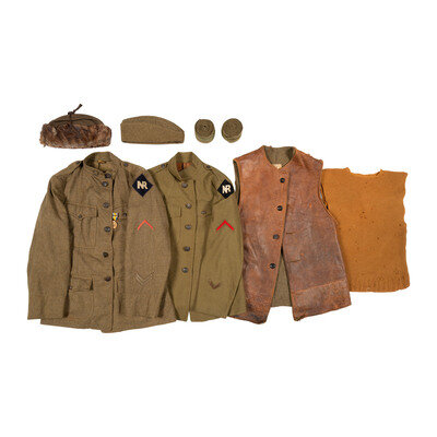 Lot includes two jackets bearing the NR shoulder patch for the 339th Infantry Regiment, one with and one without collar buttons. The one without appears to be Officer grade, and lacks officers' badges on the shoulders. Enlisted tunic comes with the RUSSIA medal with rainbow ribbon. Also included are one scarf, OD green wool and fur ushanka cap, and one leather insulated vest, all used as insulation in the severe cold experienced by the 339th Infantry Division when it was deployed as part of the Allied Intervention into the Russian Civil War.