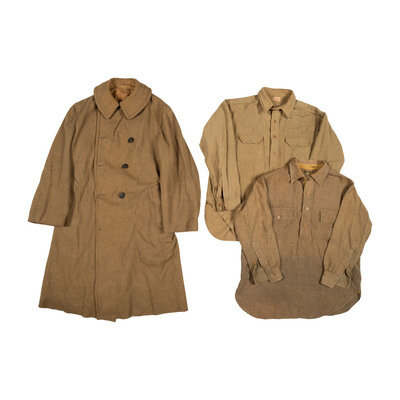 Group of Railheads Jacket and Ambulance Corps Jacket with Ambulance Corps Memorabilia and Greatcoat with Wool Canvas Shirts