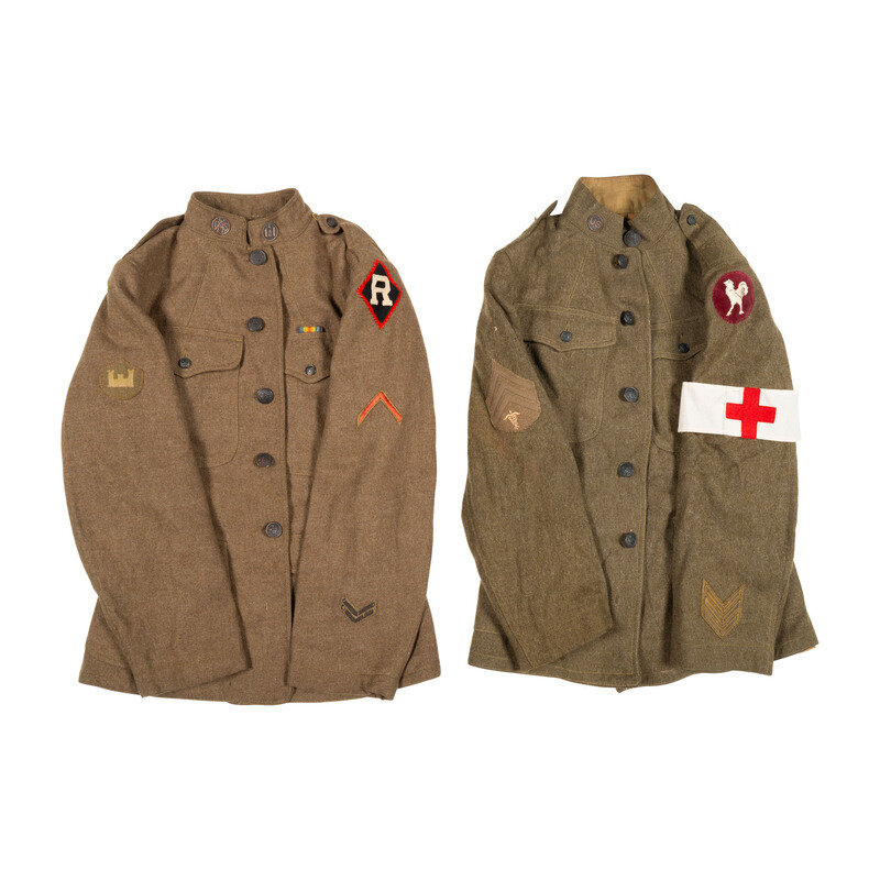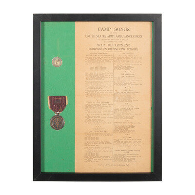 Lot includes one pattern 1917 tunic with R/{Diamond} shoulder patch of the World War I Railheads with National Army and Engineer collar discs, one tunic with an Ambulance Corps {Gallic Rooster} shoulder patch mounting Medical and US collar discs. Also included are two wool shirts, one greatcoat, and a mounted copy of CAMP SONGS OF THE UNITED STATES ARMY AMBULANCE CORPS along with the Ambulance Service Association medal and a French 20 franc coin.