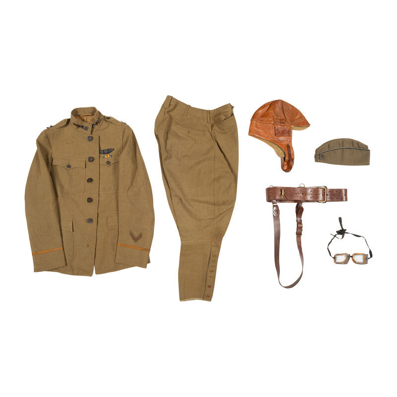 Lot includes an Officer's grade 1917 Tunic mounting Captain's shoulder bars, US collar pins, and the {Winged Propeller} Air Corps pins. Tunic further mounts embroidered pilot's wings over the left breast pocket. Further included in the lot are: one pair of matching trousers, a garrison cap with Captain's bars, a Sam Browne Belt, flight cap, and flight goggles with glass lenses, leather lined vented eye cups, and black textile straps.