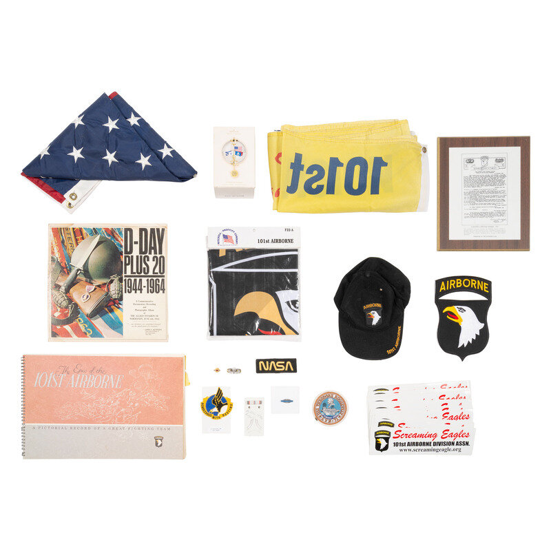 Archive includes Keith V. Organ's 1942 Jump Jacket with 101st Airborne shoulder patch, and jump wings, accompanied by his display of medals, period photographs, and his veteran's cap. The display includes both medals and appliances, including a Presidential Unit Citation, Purple Heart, Belgian Fourragere, Dutch Lanyard, WWII Victory Medal, Bronze Star, Good Conduct Medal, European-African-Middle Eastern Campaign, and the American Campaign Medal. Also included in the lot are a Paratrooper's wrist compass, post-war shoulder patches, a copy of "D-Day Plus 20: 1944-1964", a photo album including a tribute to President John F. Kennedy, and "The Epic of the 101st Airborne: A Pictorial Record of a Great Fighting Team". These older documents are joined by some commemorative stickers and flags attesting to a pride in his unit that never faltered.
