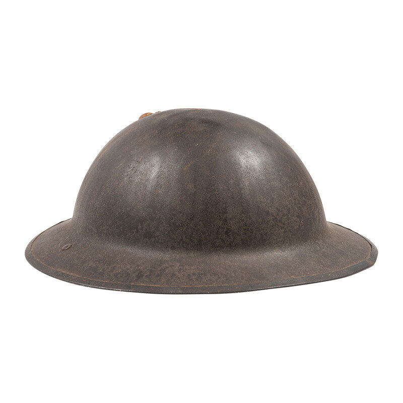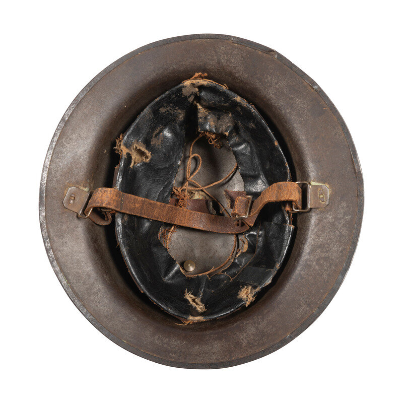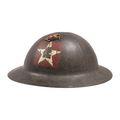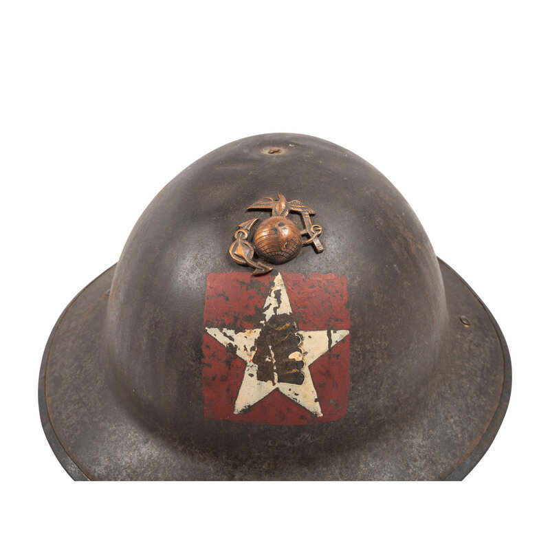 US Model 1917 steel helmet painted with the {Indian Head/Red Patch} symbol of the 1st Battalion, 5th Marines. The Marine Corps {Eagle, Globe, and Anchor} pin has been affixed to the front of the helmet through a period correct roughly punched hole. Item features a leather chin strap, suspension, and sweat band secured with rivets. Item retains the rear seam spot welded edge. Activated on May 25, 1917, the 1st Battalion, 5th Marines fought in the climactic final battles of World War I, distinguishing themselves in the battles of Aisne, Second Battle of the Marne, Battle of St. Mihiel, and the Meuse Argonne Offensive. In particular, they spearheaded the assault on Hill 142 in the midst of the Battle of Belleau Wood, crossing a wheat field raked by German machine gun fire to reach their objectives. Afterward, the Marines continued to menace German positions, eventually pushing them out of Belleau Wood. The unit remains active to this day, and continues to honor the generation that established their fearsome reputation in 1917.