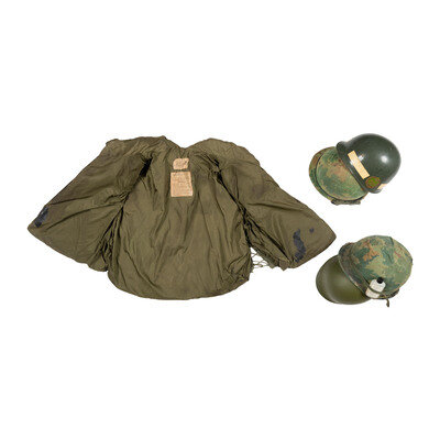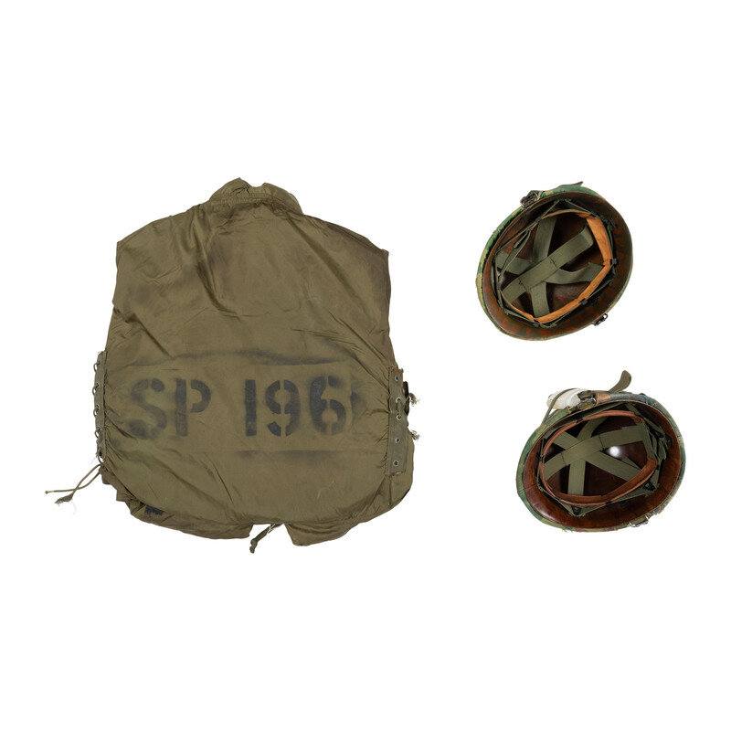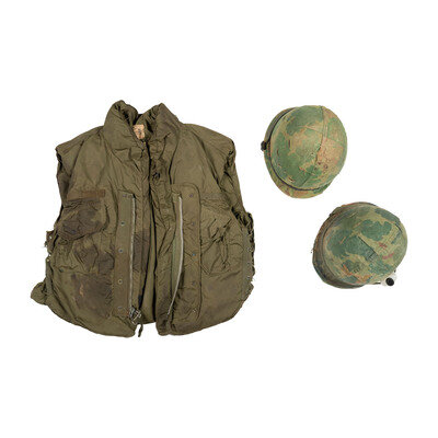 Group of Two Vietnam Era M1 Helmets and Flak Jacket
