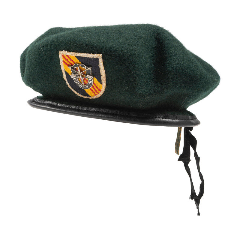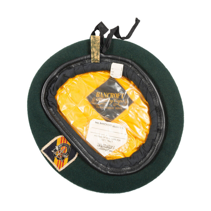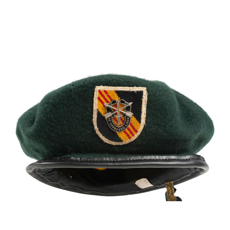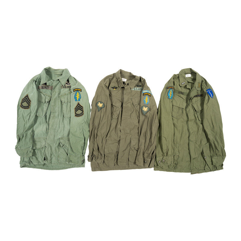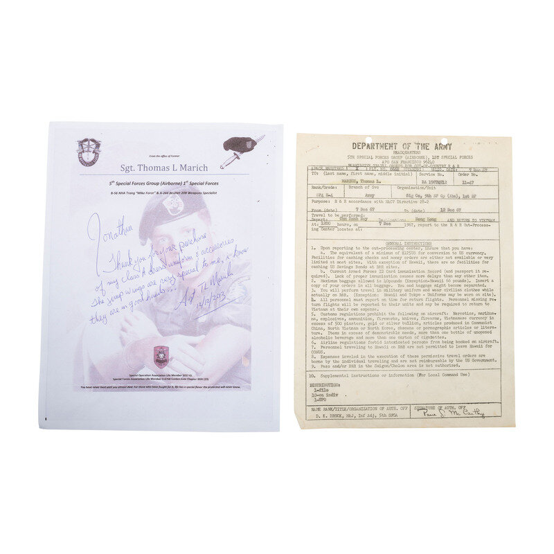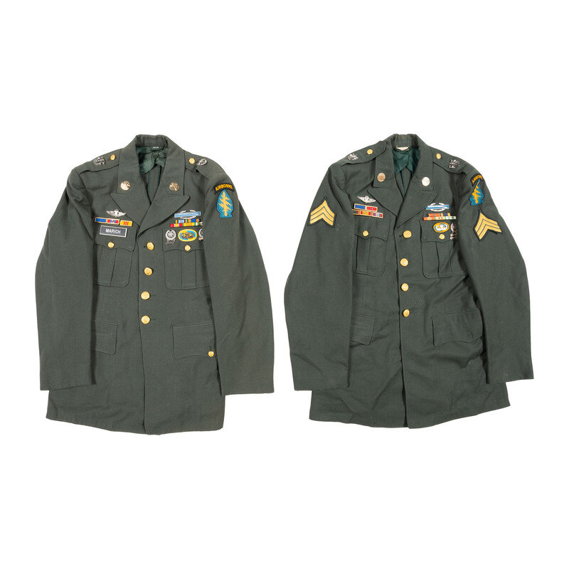 Lot includes one wool Class "A" jacket mounting a 5th Special Forces arrowhead patch with AIRBORNE patch, Jump Wings, Presidential Unit Citation, Valorous Unit Award, and Republic of Vietnam Presidential Unit Citation, Armed Forces Expeditionary Medal, Vietnam Service Medal, Republic of Vietnam Campaign Ribbon, National Defense Service Medal, and synthetic nameplate with MARICH surname. The shoulders mount US Army Special Forces pins. Accompanying the jacket are a signed and 1967 dated form for "Permissive Travel Orders for Out-of-Country R&R" issued to Thomas L. Marich, then an E-4 in the Signal Company of the 5th Special Forces Group, and a letter written by Thomas Marich to the collector of this lot personally thanking him for his purchase, and dated December 12, 2013. Additionally included in the lot are one Class "A" jacket with 5th Special Forces patch and related appliances and no applied nametag, a BANCROFT made green beret with affixed Special Forces patch and pin, a 5th Special Forces marked OD green 3rd Pattern Tropical Combat Jacket with DEWEY name patch, a second 5th Special Forces marked Tropical Combat Jacket with HARGIE surname, and one without the surname patch and likewise mounted with 5th Special Forces patches.