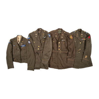 Lot includes two United States Army Air Corps appointed jackets including one full length with 12th Air Force patch, and the other an Ike Jacket with 8th Air Force patch, both with Captains' bars. Remaining jackets include a Lieutenant's Tank Destroyer and a Lieutenant's Fifth Infantry Division jacket with Engineer pin.