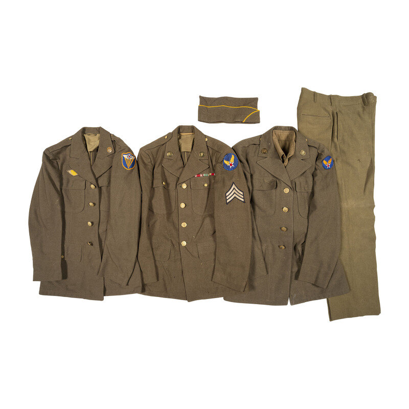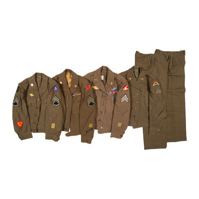 Service jackets include a 2nd Grade Technician jacket with 101st Airborne and 1st Allied Airborne Army Patches, Army Air Corps jackets with Fourth Air Force patch, and Army Air Corps patches, and one one Fifth Infantry Division. Lot further includes Ike Jackets with Anti-Aircraft Command, 7th Army, 94th Infantry Division, and 84th Infantry Division patches. Three pairs of pants included in sizes 29x31, and 32x33.